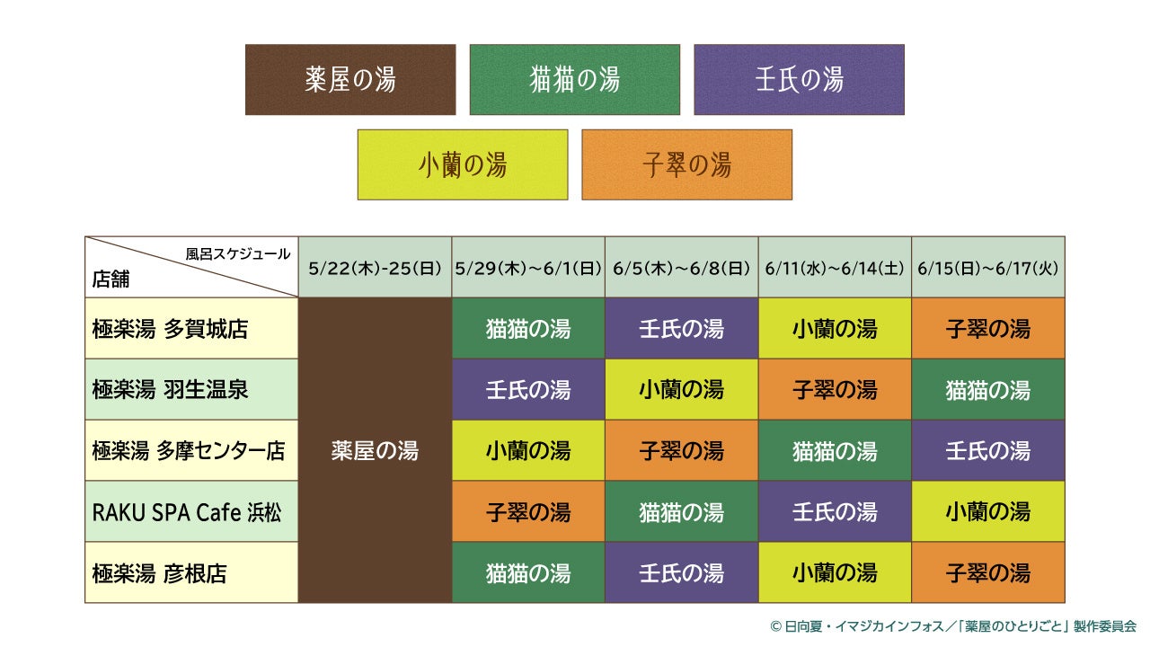 株式会社極楽湯(本社:東京都千代田区、代表取締役:佐藤 剛史)は、2025年5月22日(木)より極楽湯・RAKU SPAグループ5店舗で、TVアニメ『薬屋のひとりごと』とのコラボキャンペーンを開催いたします。