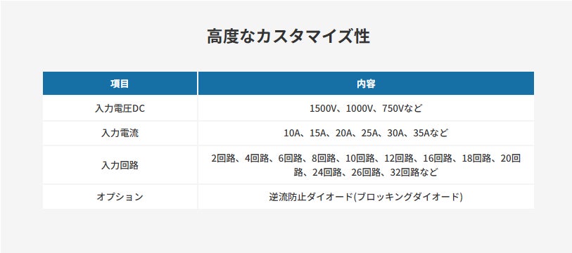 GBPでは1500Vの電圧のみならず、お客様の発電所規模や設計に応じて入力電圧(1500V、1000V、750V)入力回路数(2回路~32回路)、入力電流(10A~35A)、オプション(逆流防止ダイオード)を柔軟に選択いただけます。