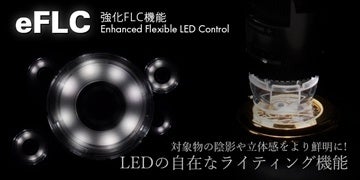 内蔵LEDの点灯箇所や明るさをコントロールするFLC機能が更に向上致しました。 eFLC では、LED(全部で4グループ)を2通りのコントロールグループに分け、コントロールグループそれぞれで明るさを32ステップの細かいレベルで調整できます。例えば、右からは強い光を、左からは弱い光を当てる、などが可能です。対象物の特徴や形状に応じた自在なライティングにより、陰影を際立たせたり、立体感を出したりすることが出来ます。