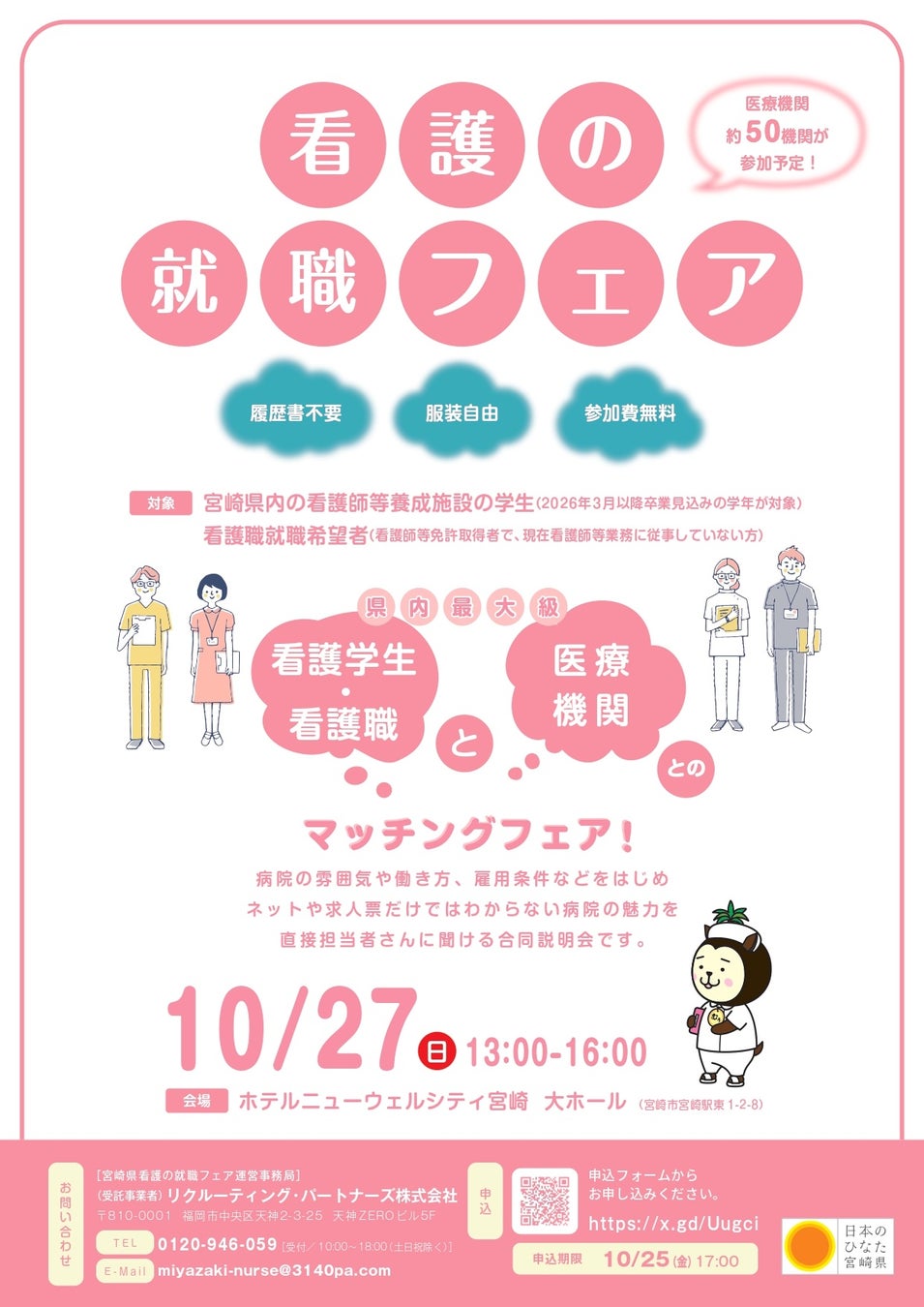 宮崎県における看護人材の確保・定着を目的に、10月27日(日)に「宮崎県看護の就職フェア」を開催します。