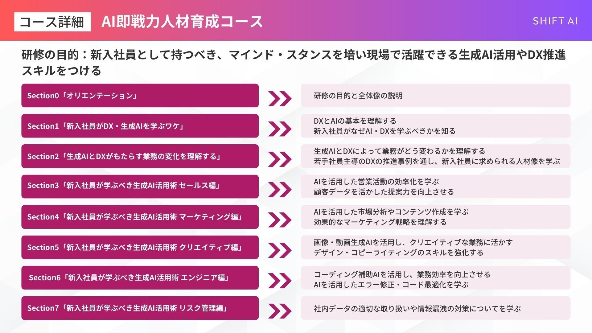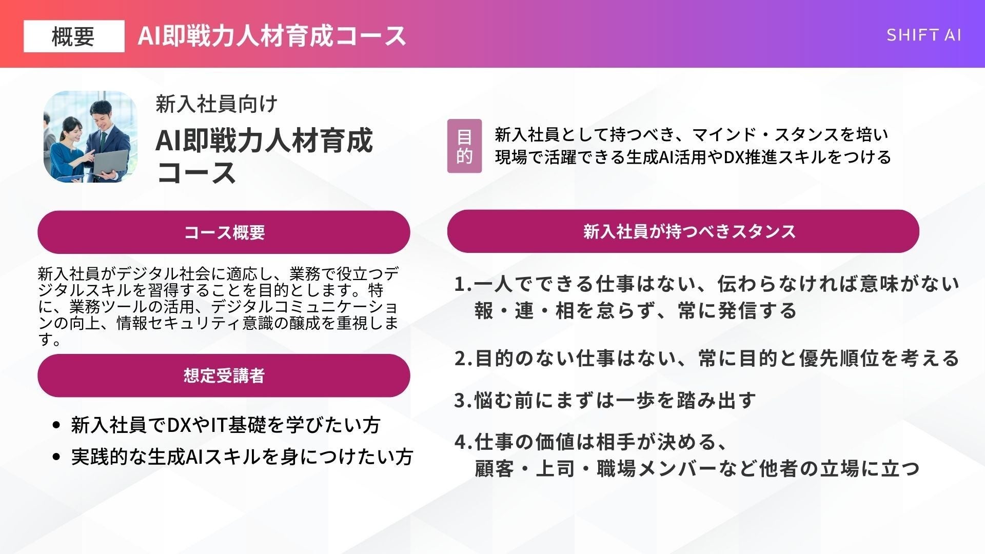 「日本をAI先進国に」を掲げAIのビジネス活用を学べる利用者数No.1※のAI大学「SHIFT AI」を運営する株式会社SHIFT AI(東京都渋谷区、代表取締役 木内翔大、以下 当社 )は、新入社員向けに、DX(デジタルトランスフォーメーション)推進に必要なスキルとマインドセットを学べる法人向け新サービス「AI即戦力人材育成コース」を2025年4月16日より提供開始します。