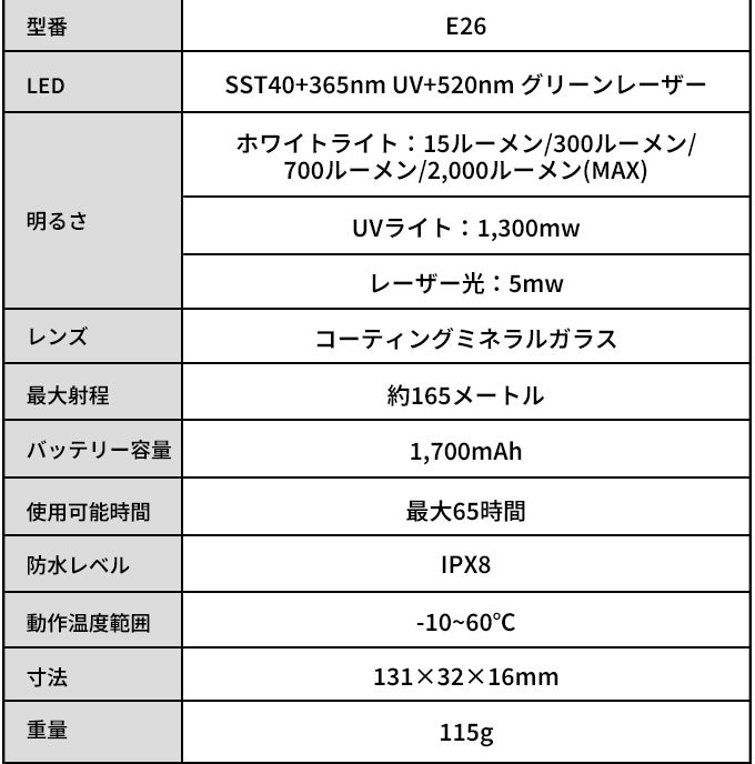 「E26」はEDCライトの照明体験に革命をもたらし、ホワイトライト、UVライト、緑色レーザー光、およびロックモードを素早く切り替えることができます。これらはすべて中央のボタン一つで制御できます。