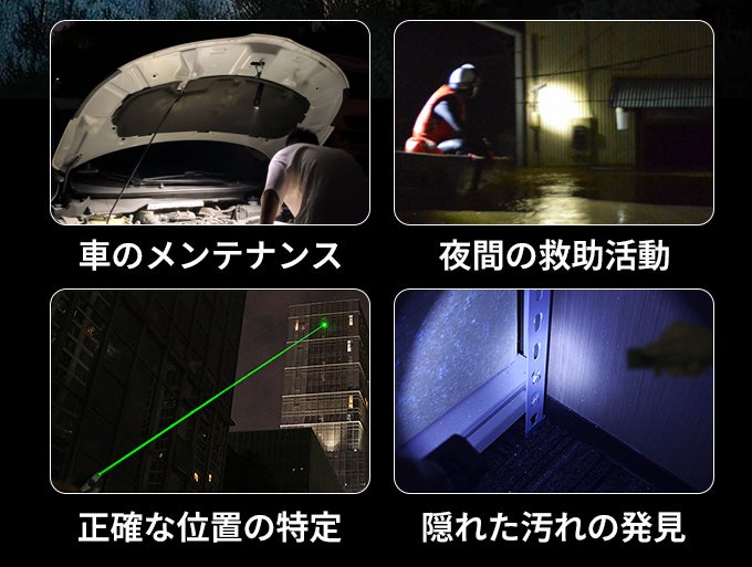 ホワイトライトは日常照明や防災に最適で、レーザー光はペットとの遊びや展示にも役立ちます。さらにUVライトは汚れやペットの尿跡、偽札確認、昆虫探索など、肉眼では見えないものを見つけるのに便利です。