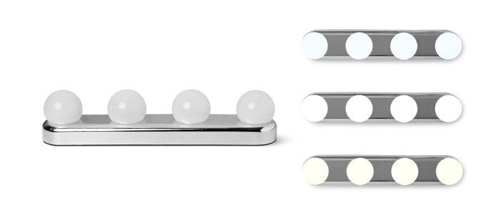 鏡に簡単に取り付けられるライト。明るい場所でメイクすると、完成度もアップ!明かりは3色のエフェクト付きです。