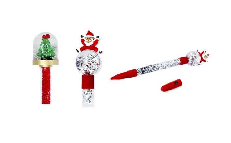てっぺんにスノードームがついた、夢があふれるボールペン。それぞれ中にはクリスマスツリーとサンタが入っています。