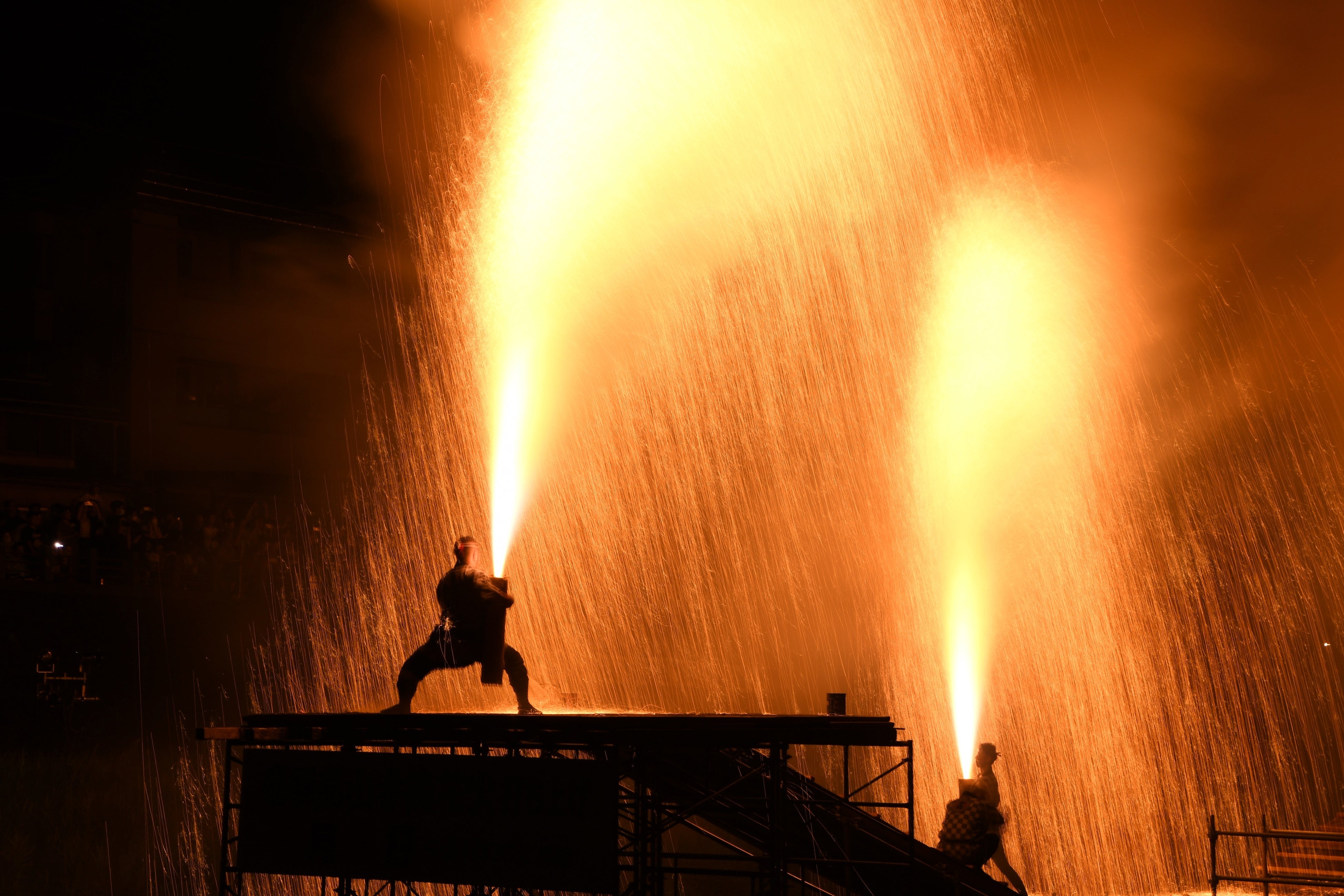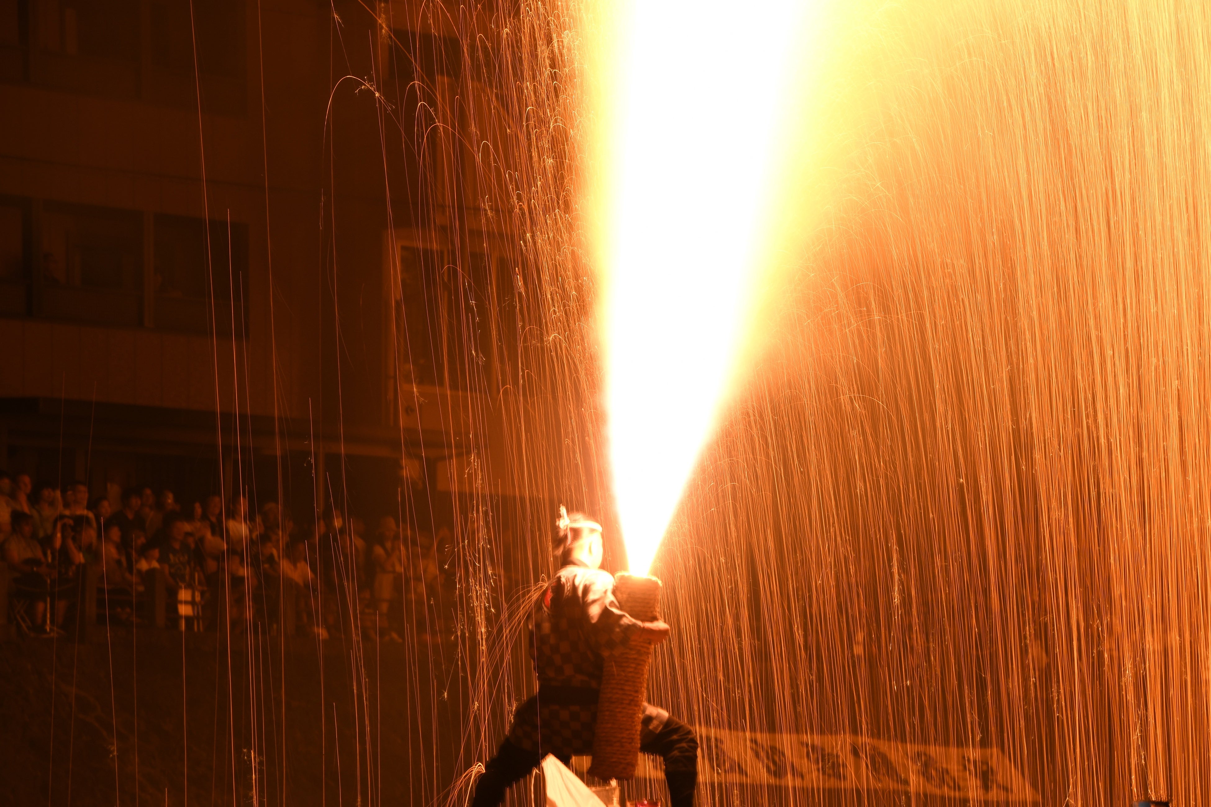 飛騨高山手筒組が火の粉を浴びながら打ち上げる勇壮な姿と、打ち上げの終わりに轟く爆音を目の前で感じてください。