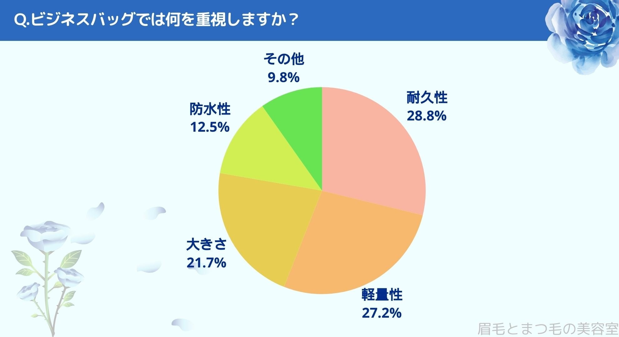 ビジネスバッグで何を重視しているのかお聞きしたところ「耐久性(28.8%)」、「軽量性(27.2%)」、「大きさ(21.7%)」、「防水性(12.5%)」、「その他(9.8%)」という結果になりました。