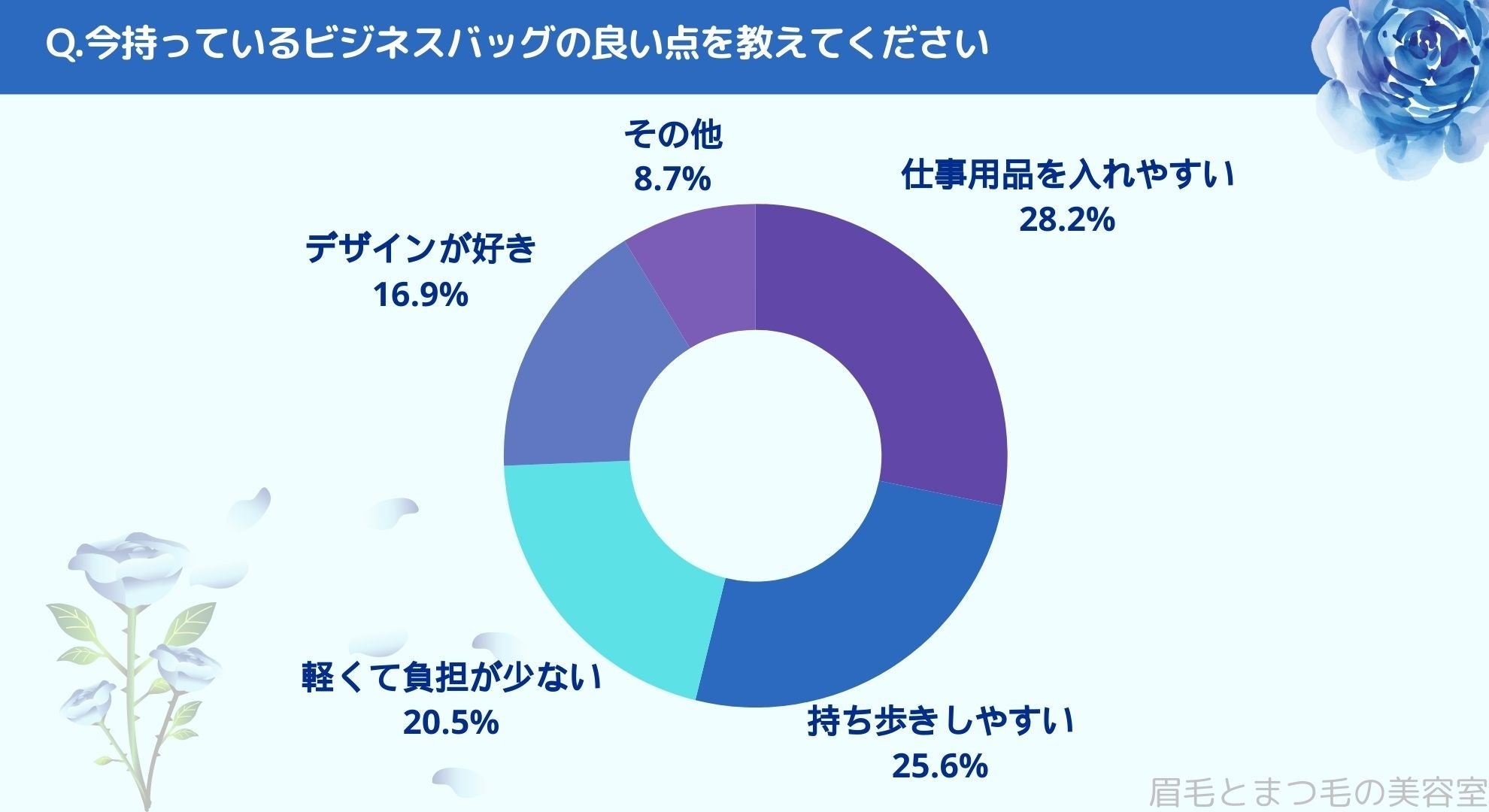 今持っているビジネスバッグの良い点をお尋ねしたところ「仕事用品を入れやすい(28.2%)」、「持ち歩きしやすい(25.6%)」、「軽くて負担が少ない(20.5%)」、「デザインが好き(16.9%)」、「その他(8.7%)」という結果になりました。