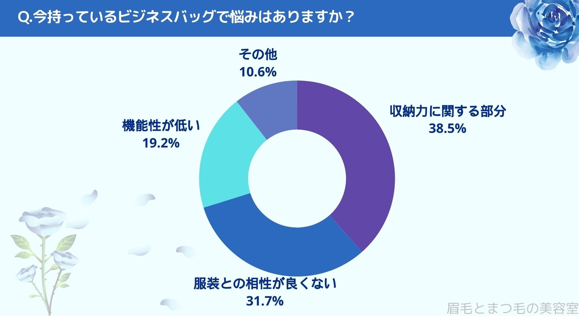 今持っているビジネスバッグで悩みがあるかお聞きしたところ「収納力に関する部分(38.5%)」、「服装との相性が良くない(31.7%)」、「機能性が低い(19.2%)」、「その他(10.6%)」という結果になりました。