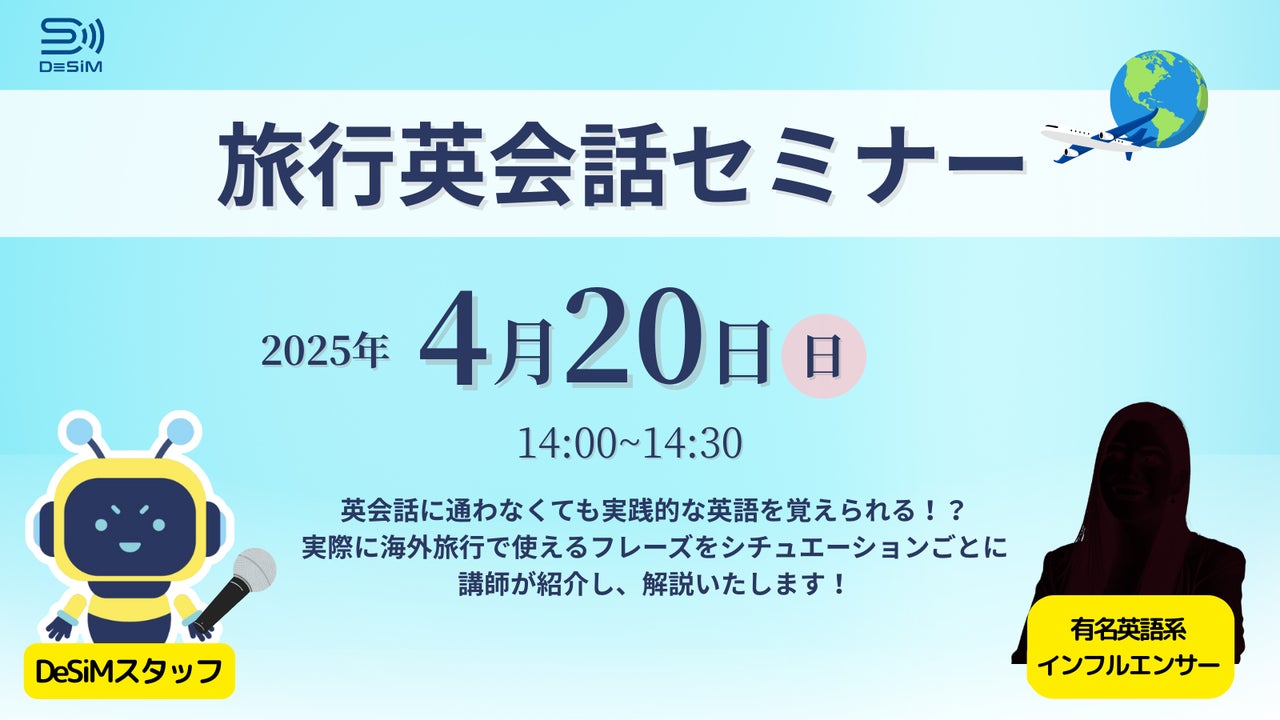 速報JAPAN株式会社(本社:兵庫県神戸市、代表取締役:賀詞)が展開するデータ通信サービスブランド「DeSiM」は、海外旅行・留学・移住を検討している方々に向けたウェビナーを2025年4月20日(日)より開催いたします。記念すべき第1回目は「旅行英語セミナー」と題し、実際の海外渡航シーンで役立つフレーズや会話術をレクチャーします。