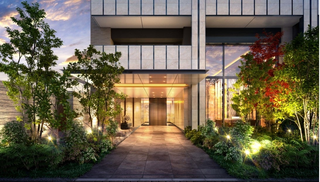 建物は、連続した庇により奥行きのあるエントランスアプローチと多彩な植栽、和モダンを想起させる格調高いラウンジ空間が特徴です。専有部は全邸南向き、角住戸率約70%の配置で、上層階・北東(角住戸)からは富士山を望むことが可能です。最上階には100㎡超えのペントハウスをご用意しました。