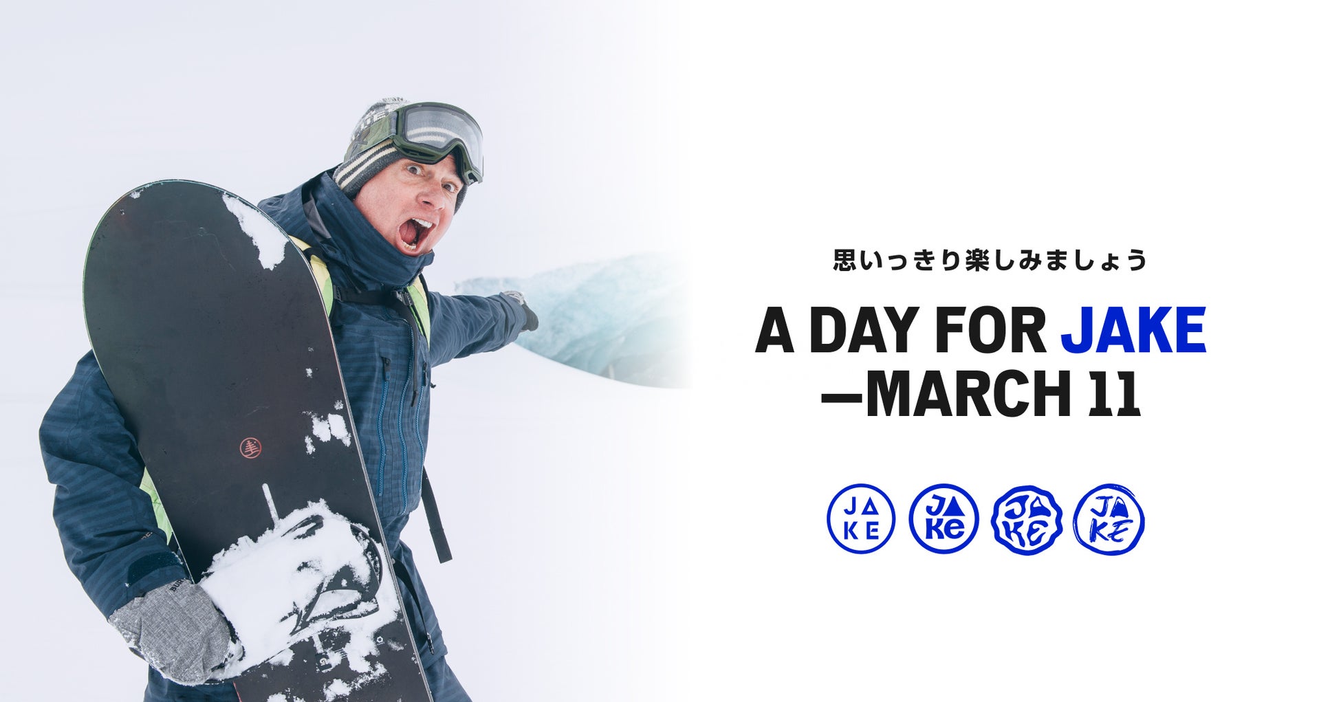「A DAY FOR JAKE」は、2019年11月に亡くなったジェイクを偲び、そのレガシーを讃えるために、2020年から設定されました。新型コロナウイルス感染拡大の影響により、リゾートでのイベント等が実施しづらい中で、対象ショップにてオリジナルステッカーを配布し、スノーボードに貼ってジェイクに想いを馳せながらライディングを楽しんでもらったり、あるいはスノーボードムービーの視聴やギアのメンテナンスなども含めて、“各々がスノーボードを思いっきり楽しむ日”としてメッセージを発信してきました。