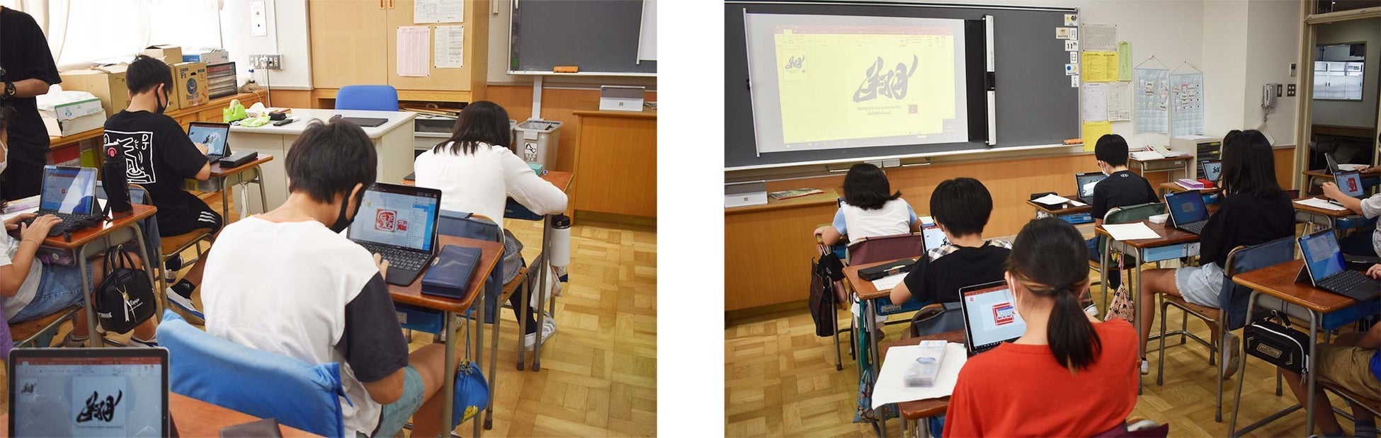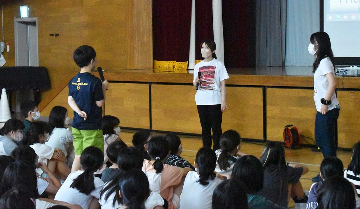 イベントは、月島第三小学校の6年生を対象に行いました。プログラム前半では、Tシャツができるまでの過程を説明し、後半は児童がタブレット端末でTシャツの一部をデザインするワークショップを行いました。