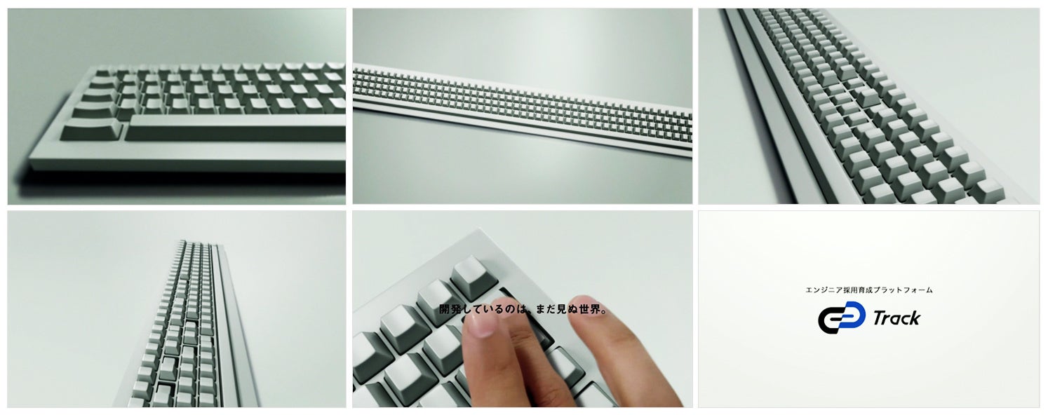 無限に続く一本の文字なしキーボードをエンジニアの歩む道のり(track)に例えて、エンジニアの歩みを打鍵されるキーボードで視覚的・象徴的に表現しました。時に立ち止まったり転んだりしながら、プロジェクト/エンジニアとしての一つのゴール(enter)に向かう姿を、シンプルな世界観とストイックなナレーションでエンジニアたちを奮い立たせるような読後感になっています。
