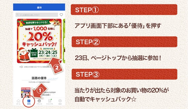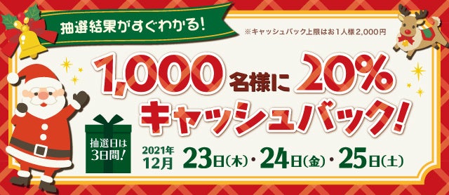 「当たり」が出た1,000名様へは、年末年始(2021年12月23日(木)~2022年1月10日(月)まで)のお買い物の20%(上限2,000円)を自動的にキャッシュバックいたします。