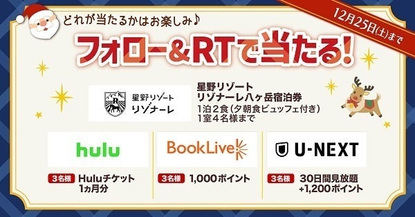 また、クリスマス抽選会に先駆け、Twitter公式アカウントにて「優待のあるお店」の人気サービスでご利用可能な豪華賞品が当たるフォロー&リツイートキャンペーンを12月25日(土)まで開催しています。