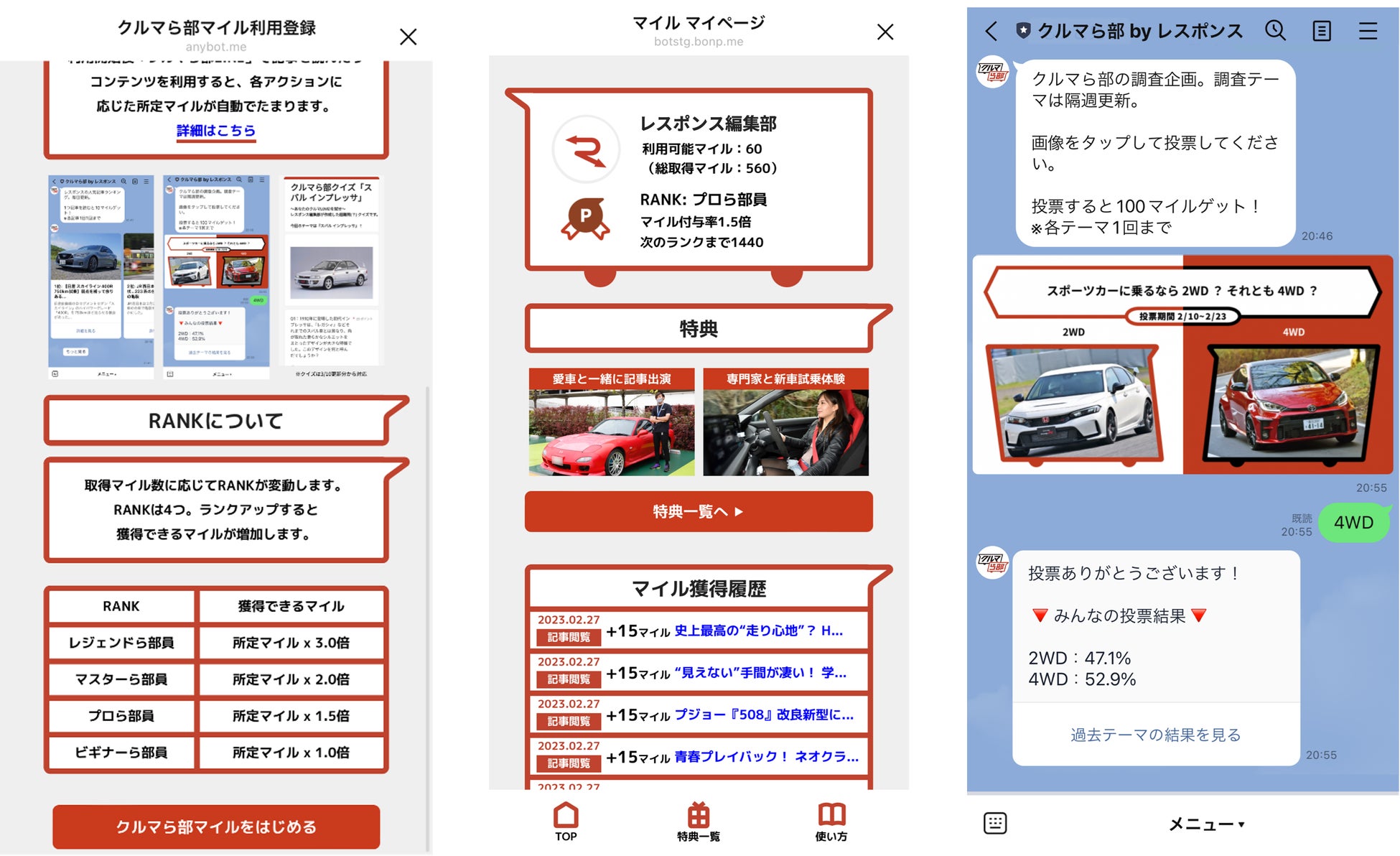 レスポンス、クルマ好きのためのLINEサービス『クルマら部』にマイルプログラム機能を追加