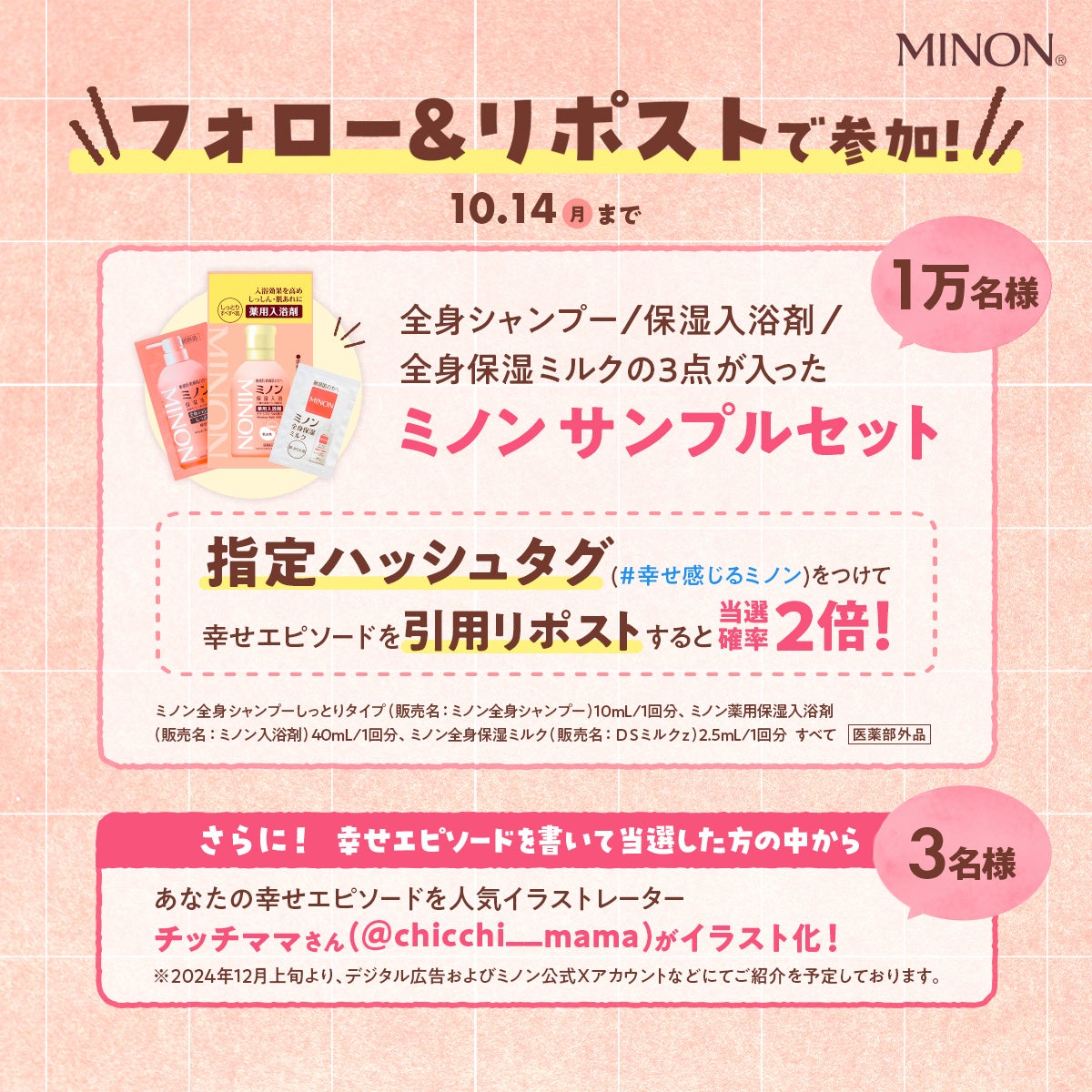 X(旧Twitter)にて、ミノンサンプルセットが1万名様に当たるフォロー&リポストキャンペーンを実施します。さらに、キャンペーン投稿に「#幸せ感じるミノン」をつけて「ご自身の幸せエピソード」を引用リポストしていただくと、当選確率が2倍にアップ。上記方法でご応募いただいた方のうち3名様のエピソードは、人気イラストレーターチッチママ(@chicchi__mama)さんがイラスト化し、後日ミノンのデジタル広告や公式アカウントなどにてご紹介を予定しております。