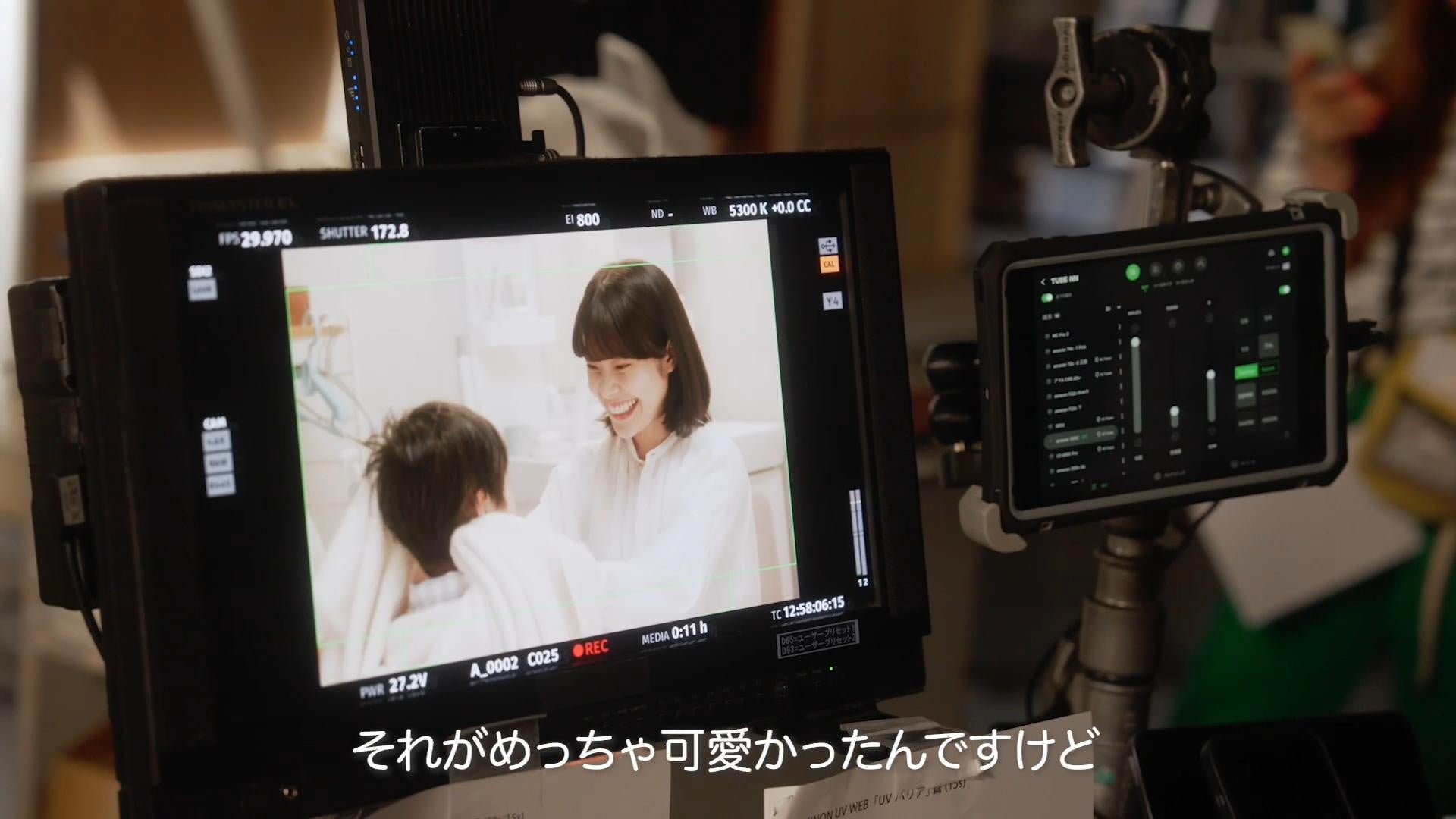 今回でTV-CMへのご出演が5年目となる岸井さん・小関さん。本作で、初めて子役を交えた家族での撮影シーンとなりました。息子役の夏希くん(以下:なっくん)のスタジオを駆け回るなど元気いっぱいの姿に、岸井さんと小関さんも思わずにっこり。本番では、まるで本物の家族かのような息の合った掛け合いに、現場は和やかな空気に包まれました。カメラが回っていないところでも、コミュニケーションを重ね、最後には3人で仲良く一緒に遊んでいる姿がとても印象的でした。監督による、家族を想うやさしさあふれる表情や目配りなど、細かな指示に対しても岸井さん・小関さんともに真摯に向き合って何度も挑戦していただきました。ミノンのやさしいイメージが存分に伝わる、心が温かくなる素敵なTV-CMが完成しました。