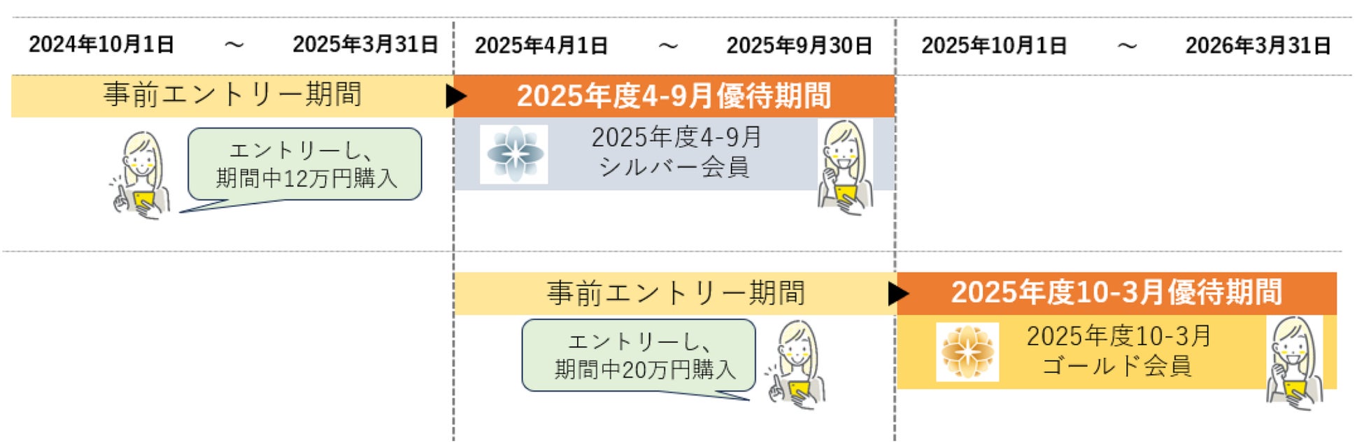 2024年10月1日~2025年3月31日の間にエントリーすることで2025年度4~9月の優待対象となりますが、継続して2025年度10~3月の優待対象となるには、2025年4月1日~2025年9月30日の間に再エントリーが必要です。