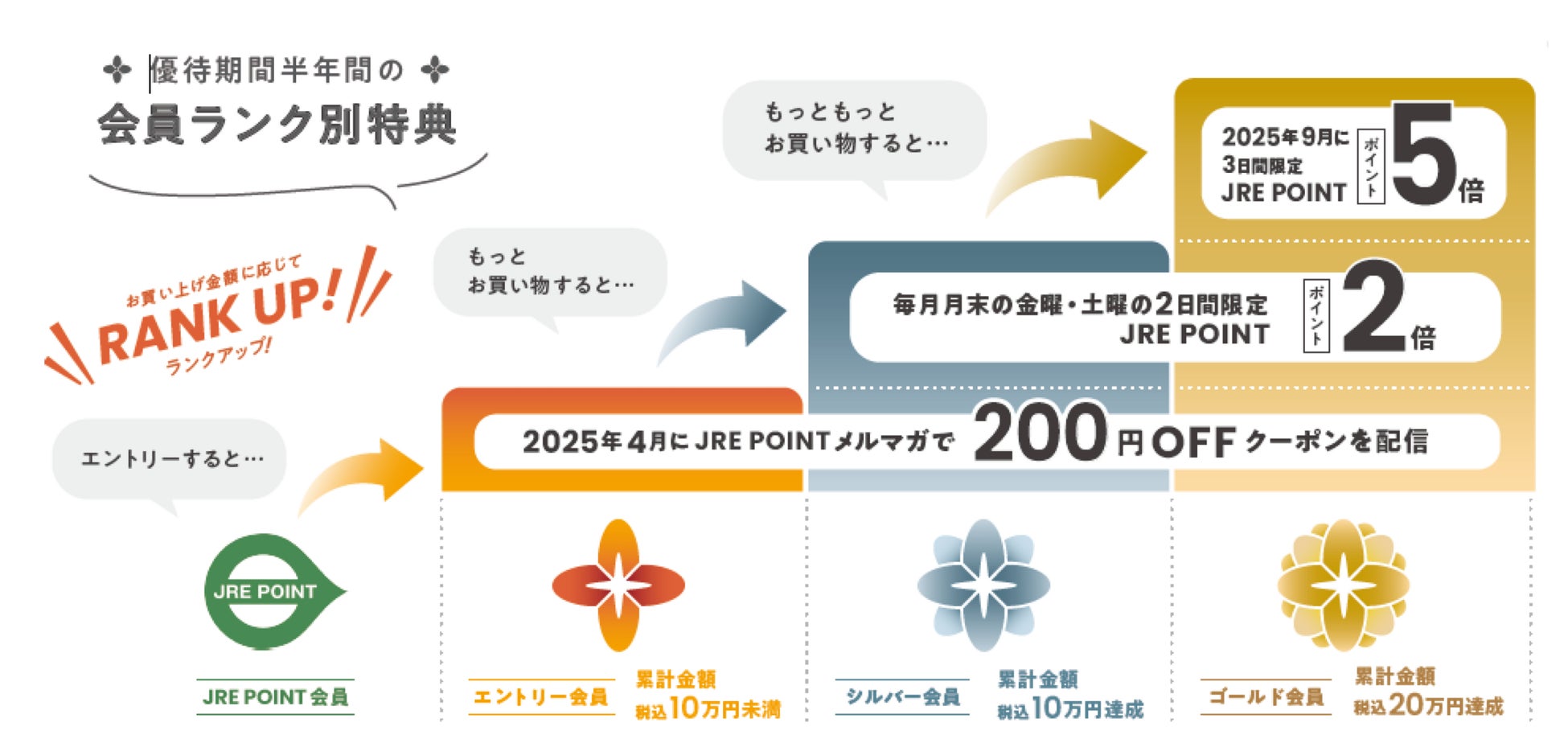 半年間のお買い上げ金額に応じた3つのランク(ゴールド会員、シルバー会員、エントリー会員)を設けており、ランクごとの特典をご用意しています。