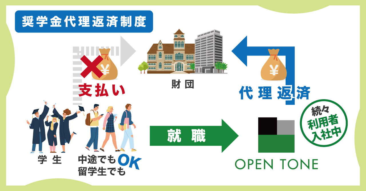 株式会社オープントーンでは、社員のスカラーシップ(貸与方奨学金)を報酬とは別に会社が代理返済する「奨学金代理返済制度」がございます。