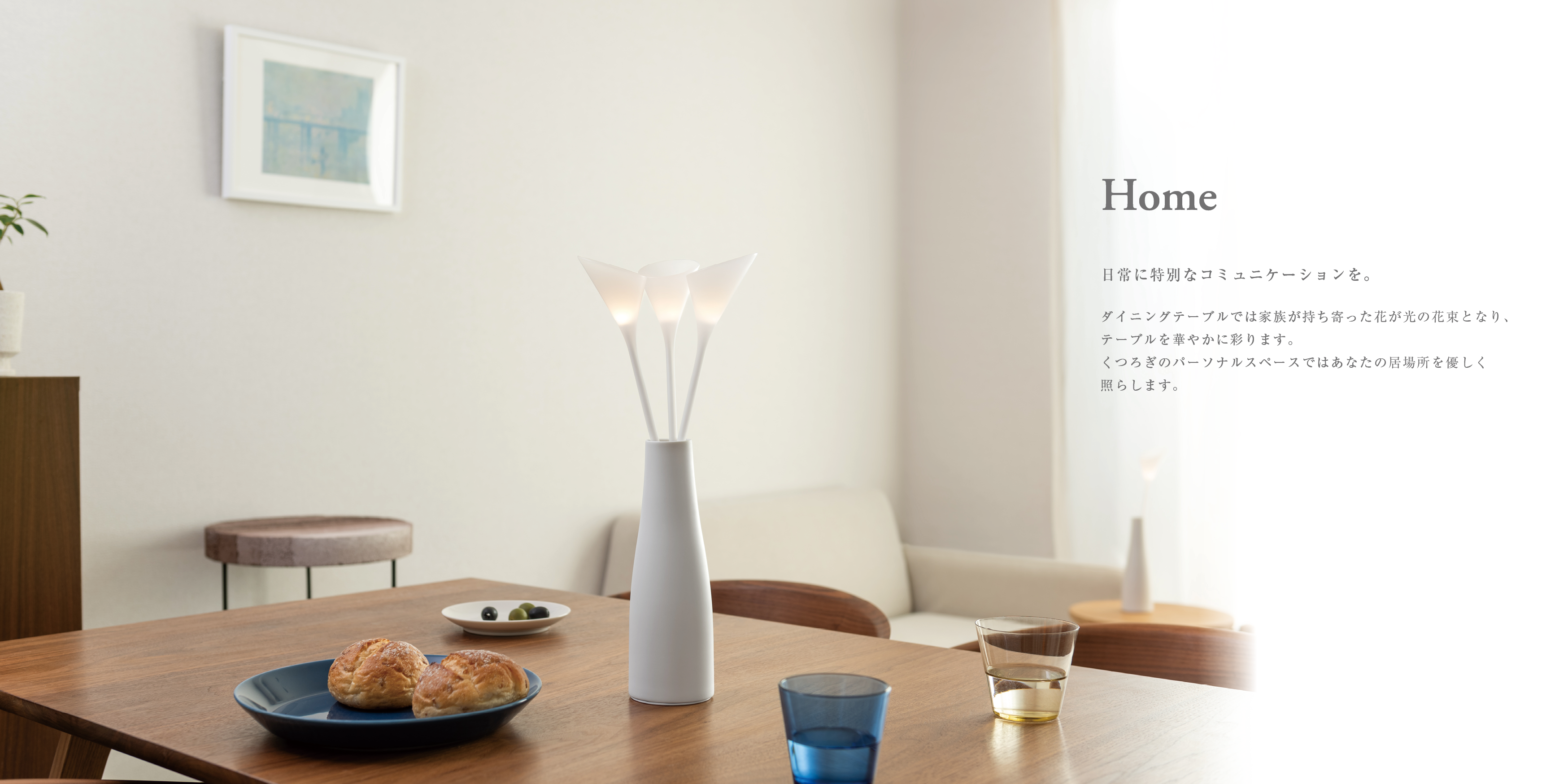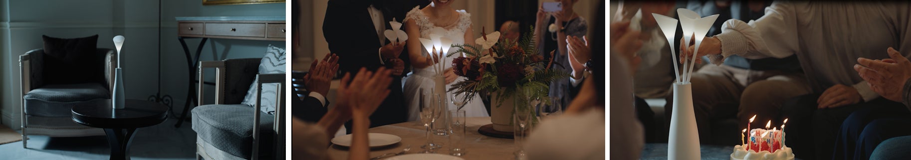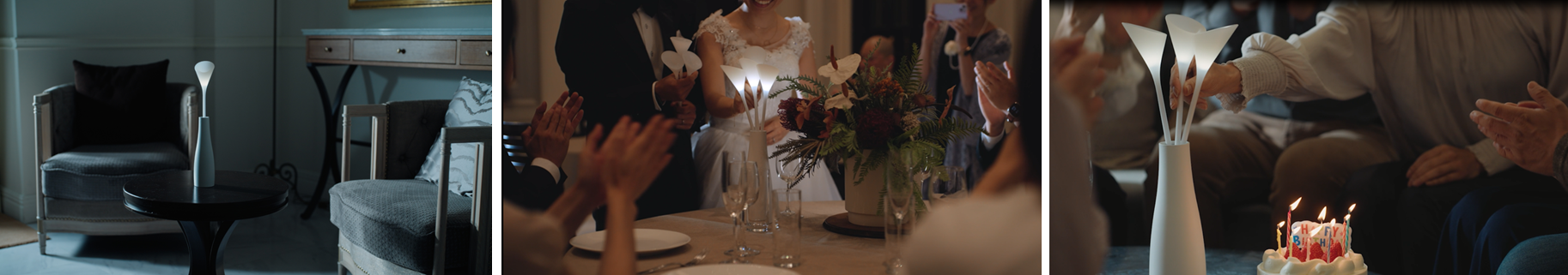 バースデー、ウエディング、レストランなど大切な人と過ごす時間では、持ち寄った光の花が特別な時間を演出し、くつろぎのパーソナルスペースでは、手元の一輪があなたの居場所を優しく照らします。