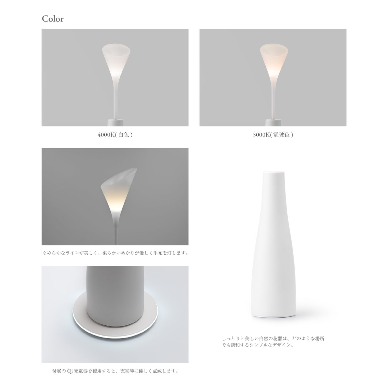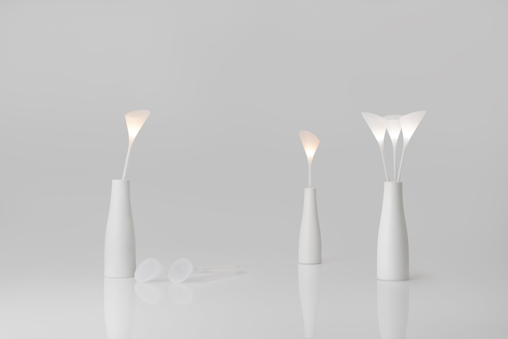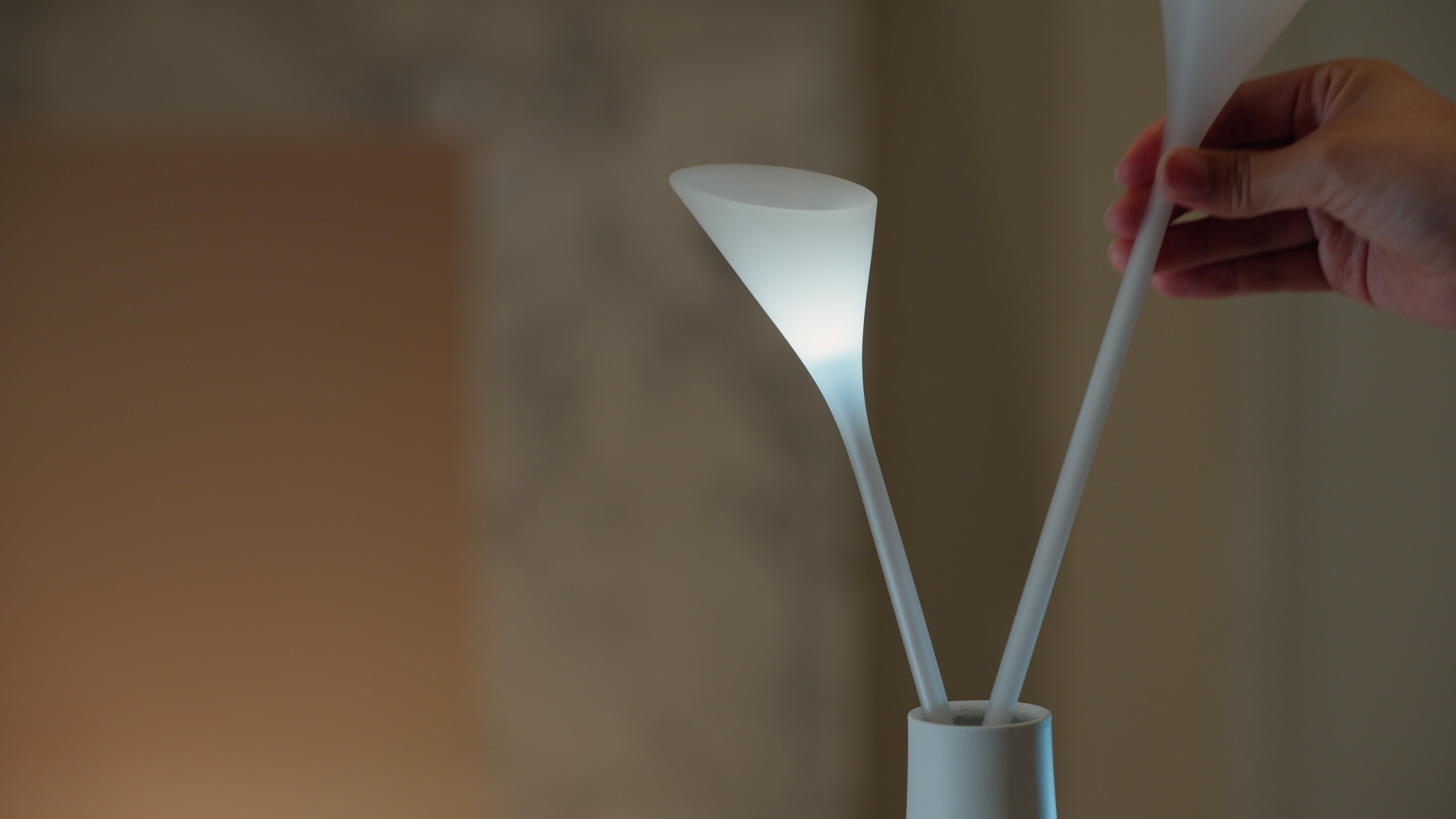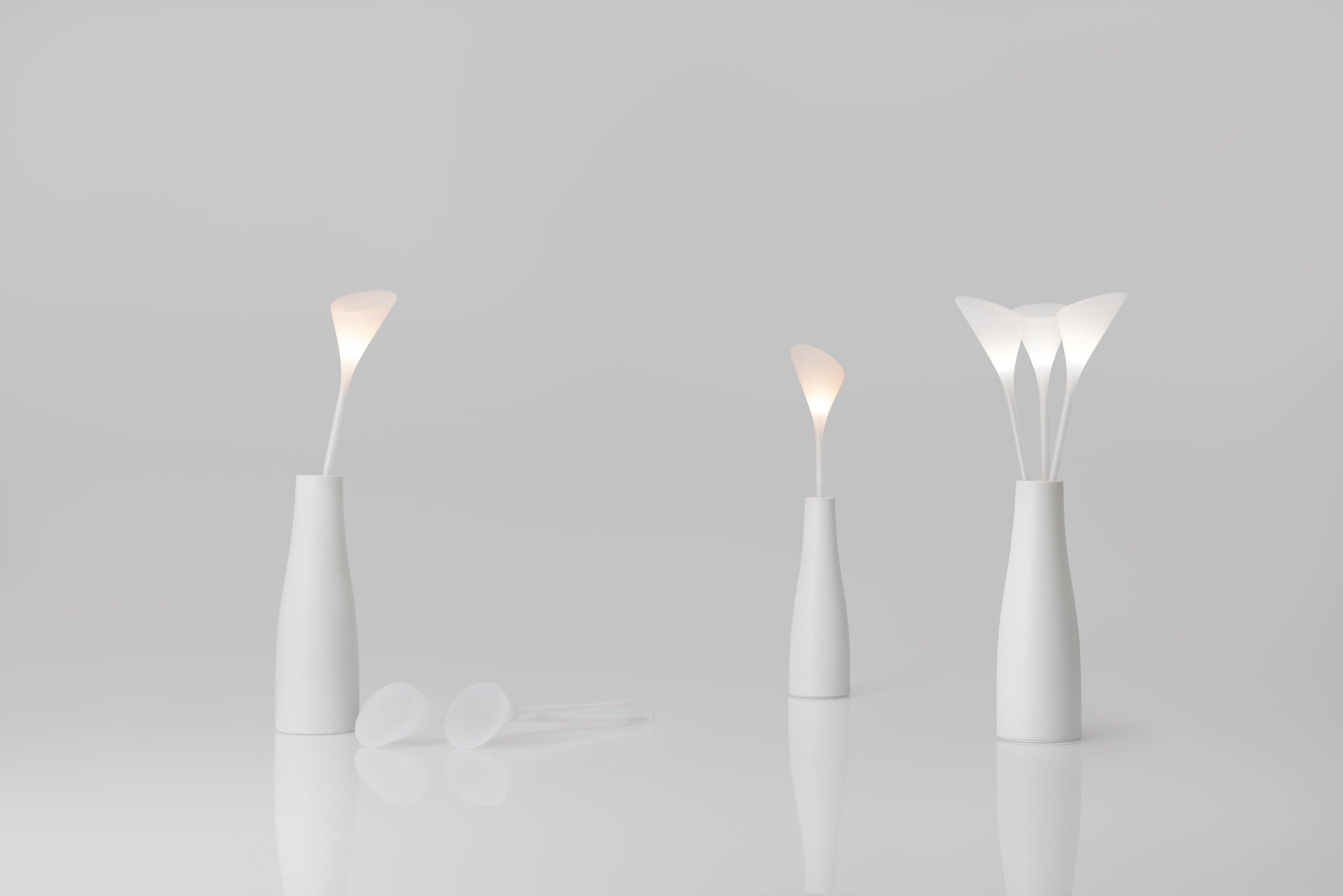 オブジェのような花型の照明を花瓶に挿すことで、ワイヤレス給電により電力が伝わり、まるでキャンドルのように優しくあかりが灯ります。