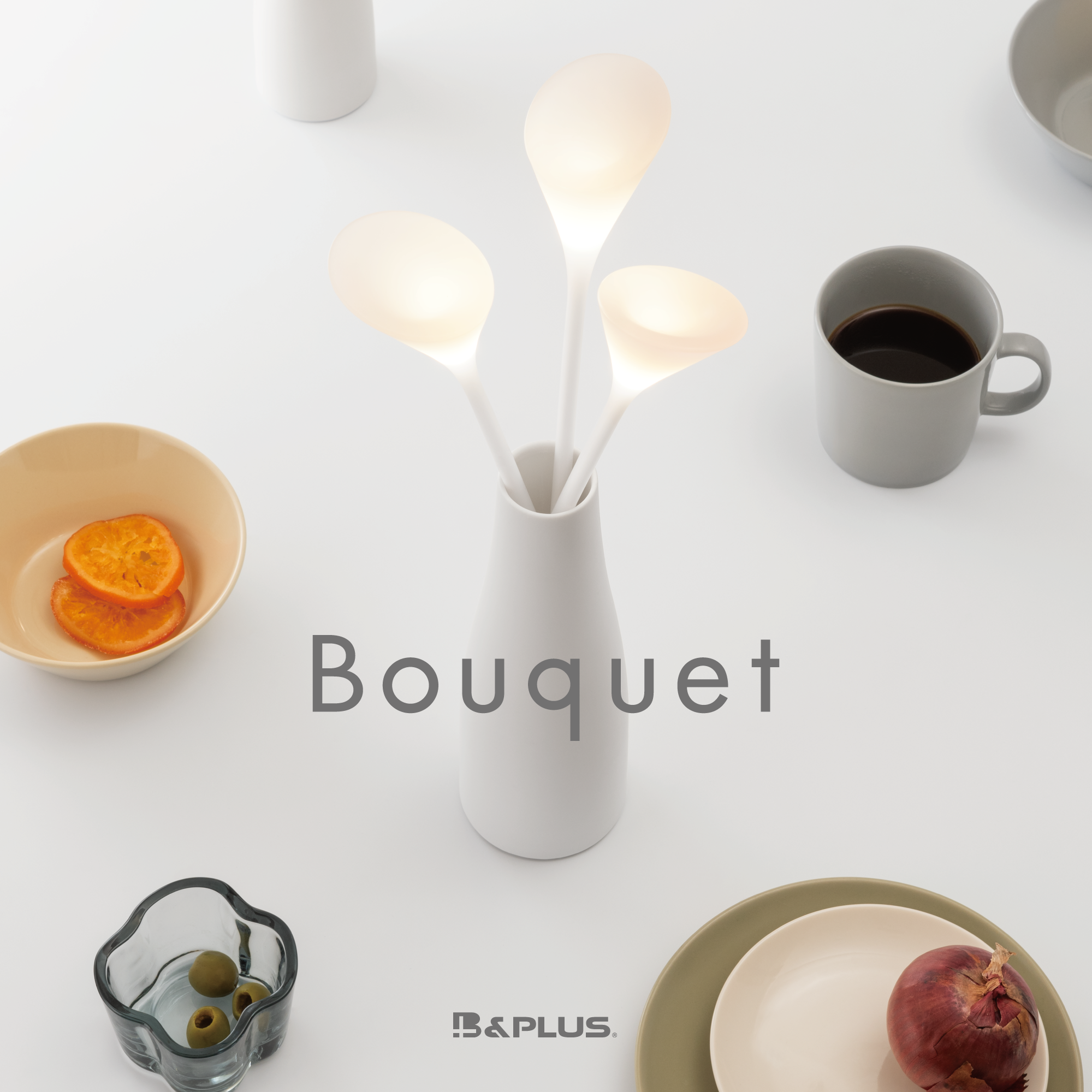 『Bouquet』は、デザインユニット『myna.(ミナ)』の監修の元、開発を進めてきました。デザイナーならではの洗練された美しいデザインとワイヤレス給電技術がマッチした新しい形の照明です。