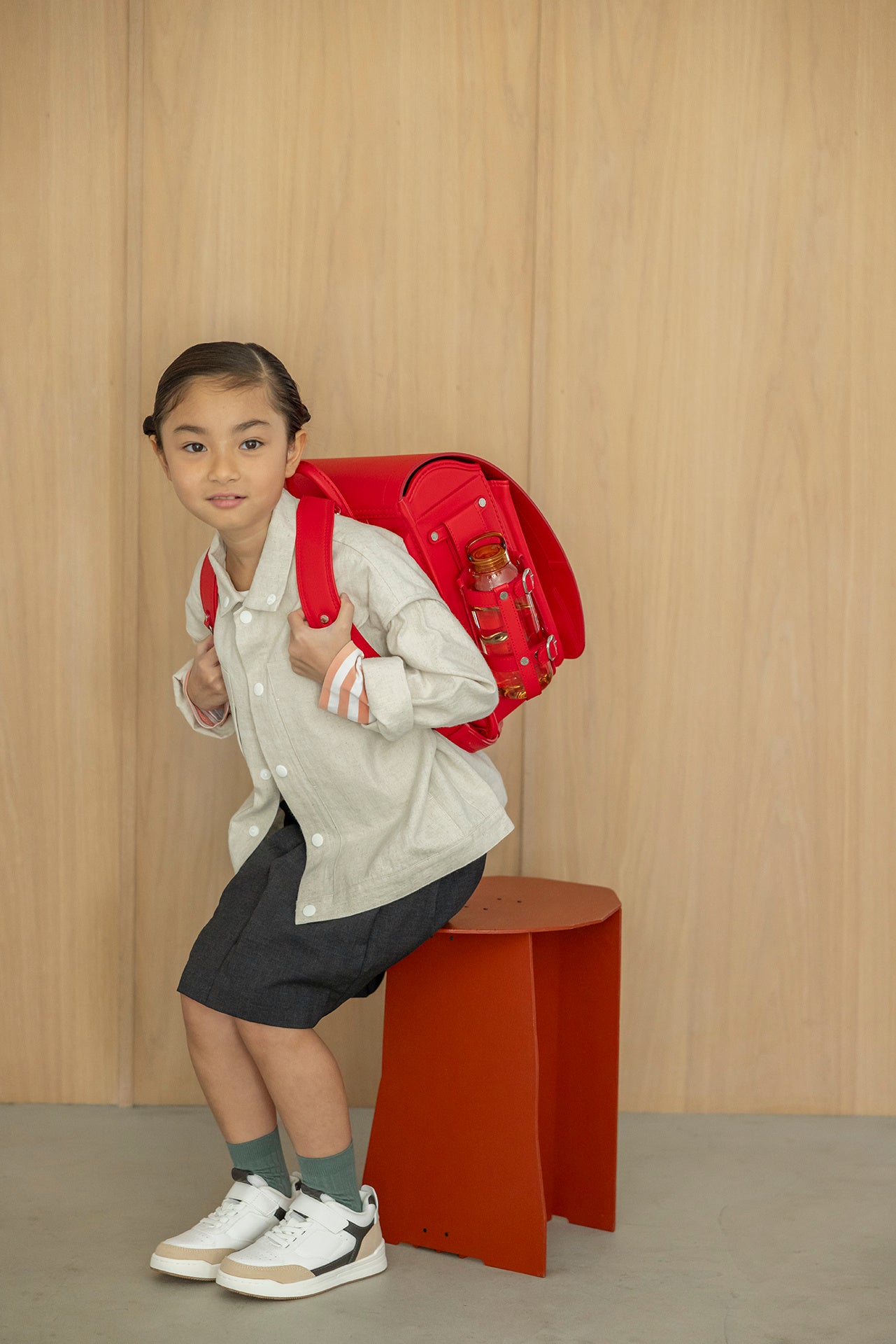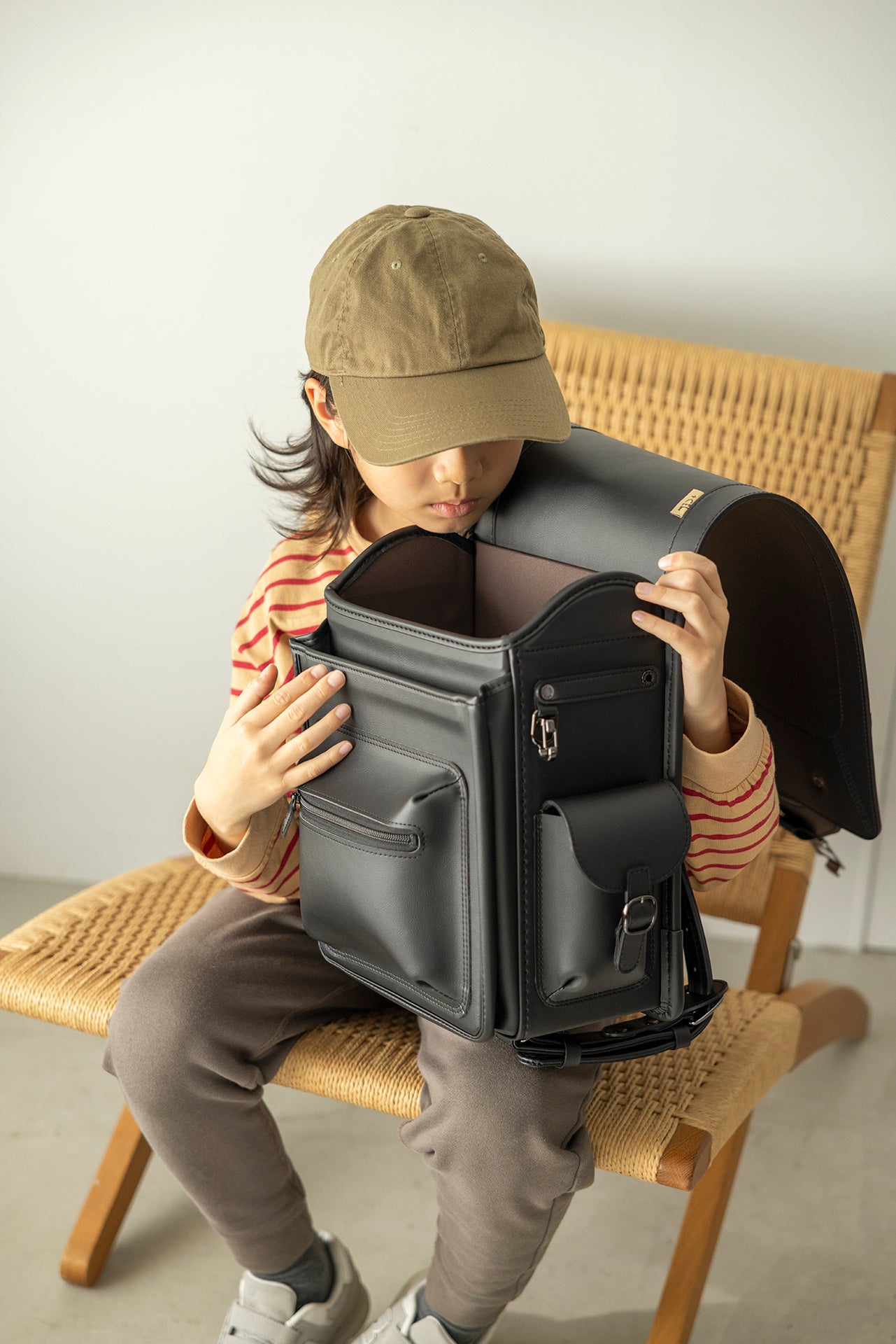 プロダクトデザイナー、柴田文江さんが手がけた、まったく新しいデザインのランドセル〈NOBLE〉。今一度ランドセルをカバンとして捉え直し、上部を開閉口としました。そのため低学年でも開け閉めしやすく、荷物も取り出しやすくなっています。また「かぶせ」がないために軽量で、それでいて一目でランドセルとわかる四角い形に仕上げてあります。