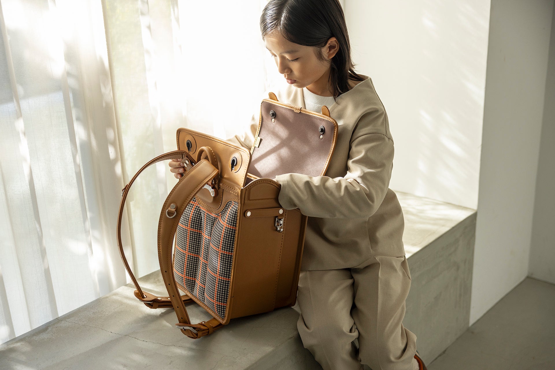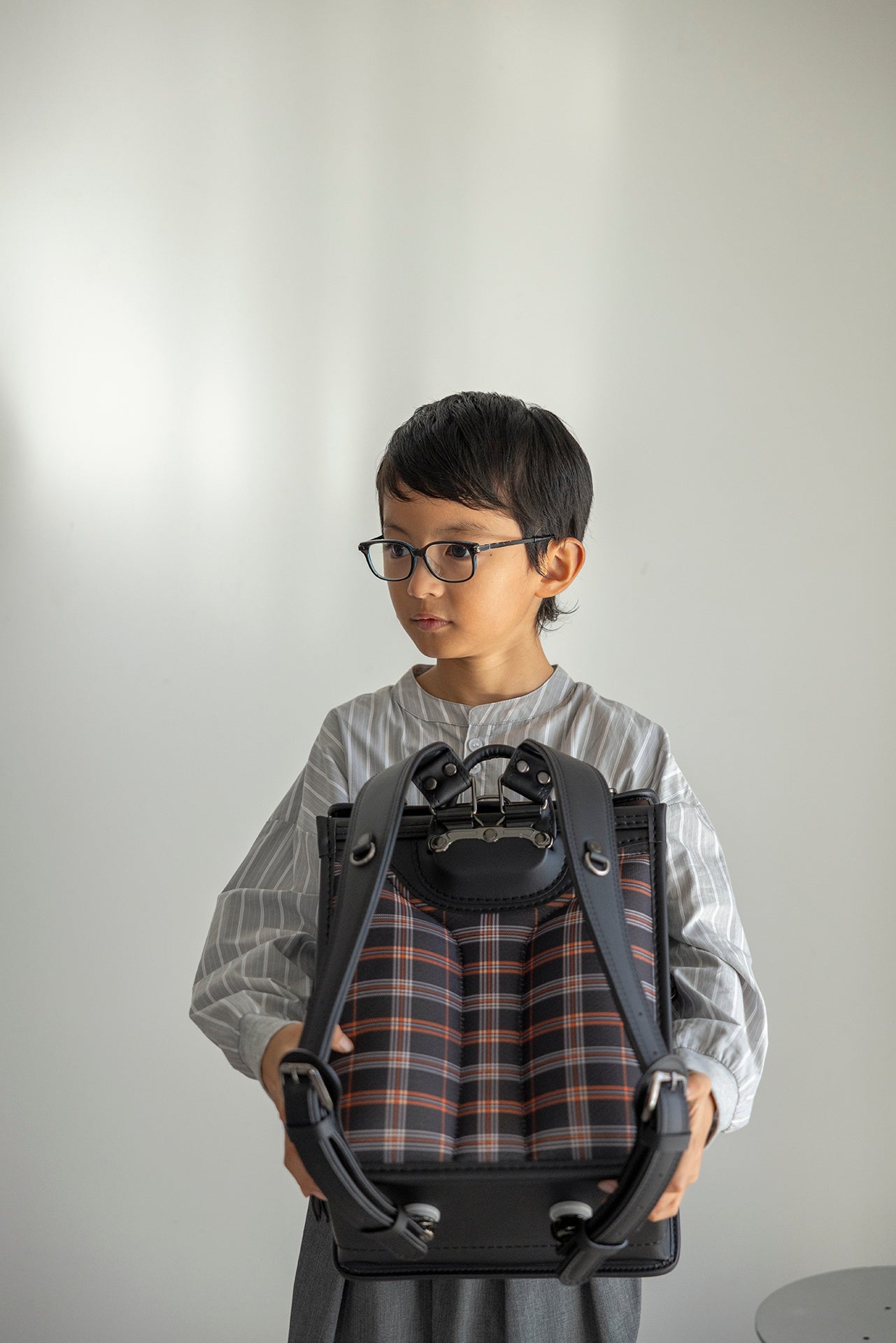 カラーは、マットな質感で、レッド、ブラック、キャメル、グリーンといったクラシックで落ち着いた4つのカラーを展開。これまでのランドセルの背面は、ほぼすべてクリーム色でしたが、〈NOBLE〉ではランドセルのカラーに合わせて、柴田文江さんがデザインしたそれぞれ異なるオリジナルのチェック柄をあしらっています。クッション性と通気性に優れた、メッシュ素材を採用しています。
