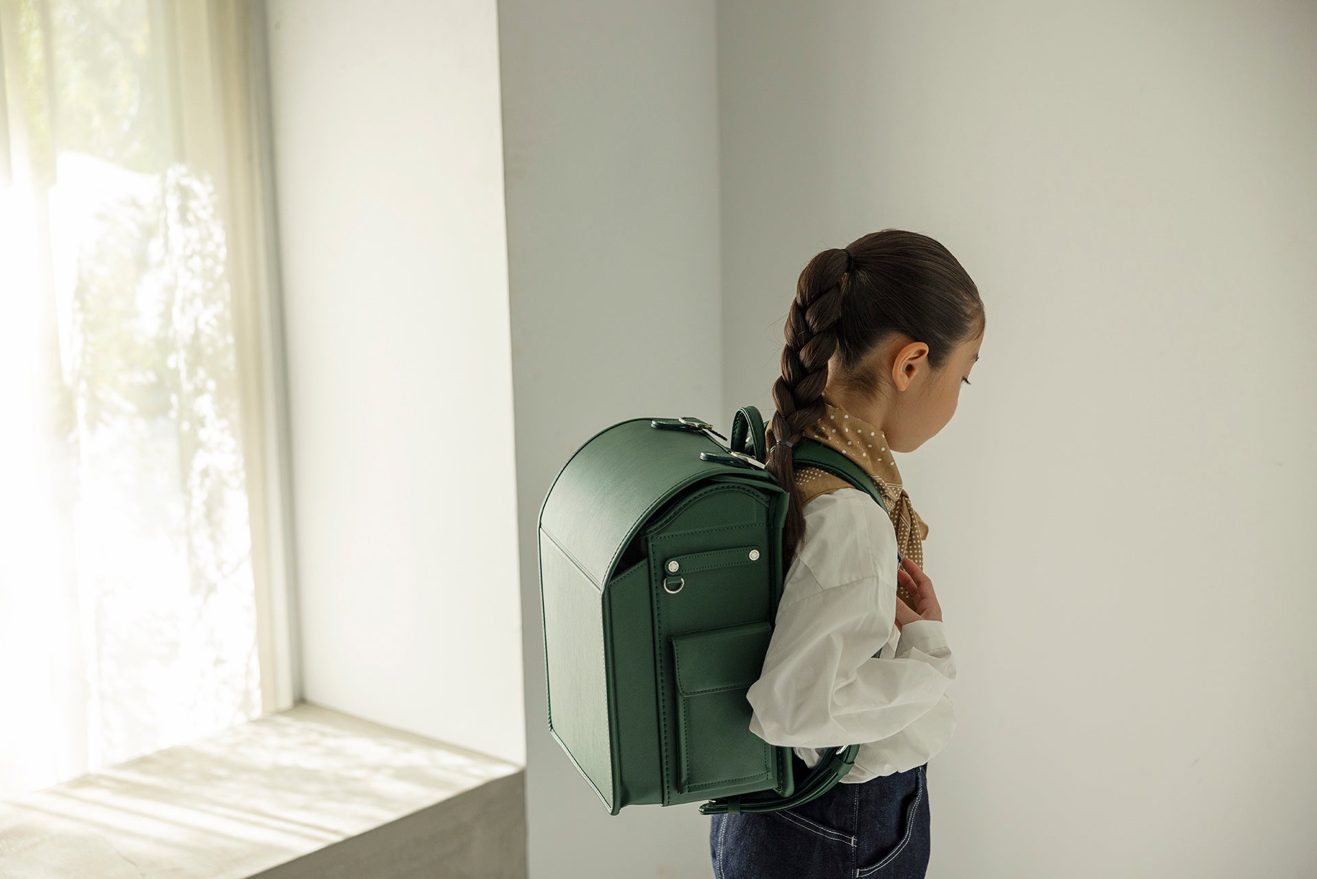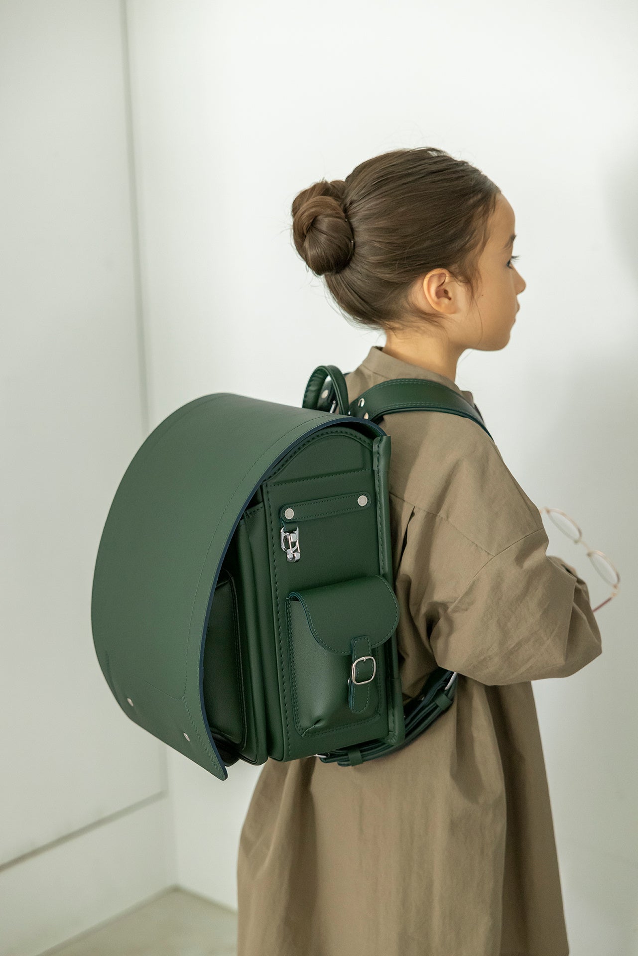 サイドにはキッズ用の携帯電話が入るマグネット式の蓋つきポケットがあります。「かぶせ」のステッチをデザインとして捉えるなど、上品な革のカバンとしてのランドセルを見つめ直して作りました。背面まで同じカラーを採用することによって、統一感を生み出しています。