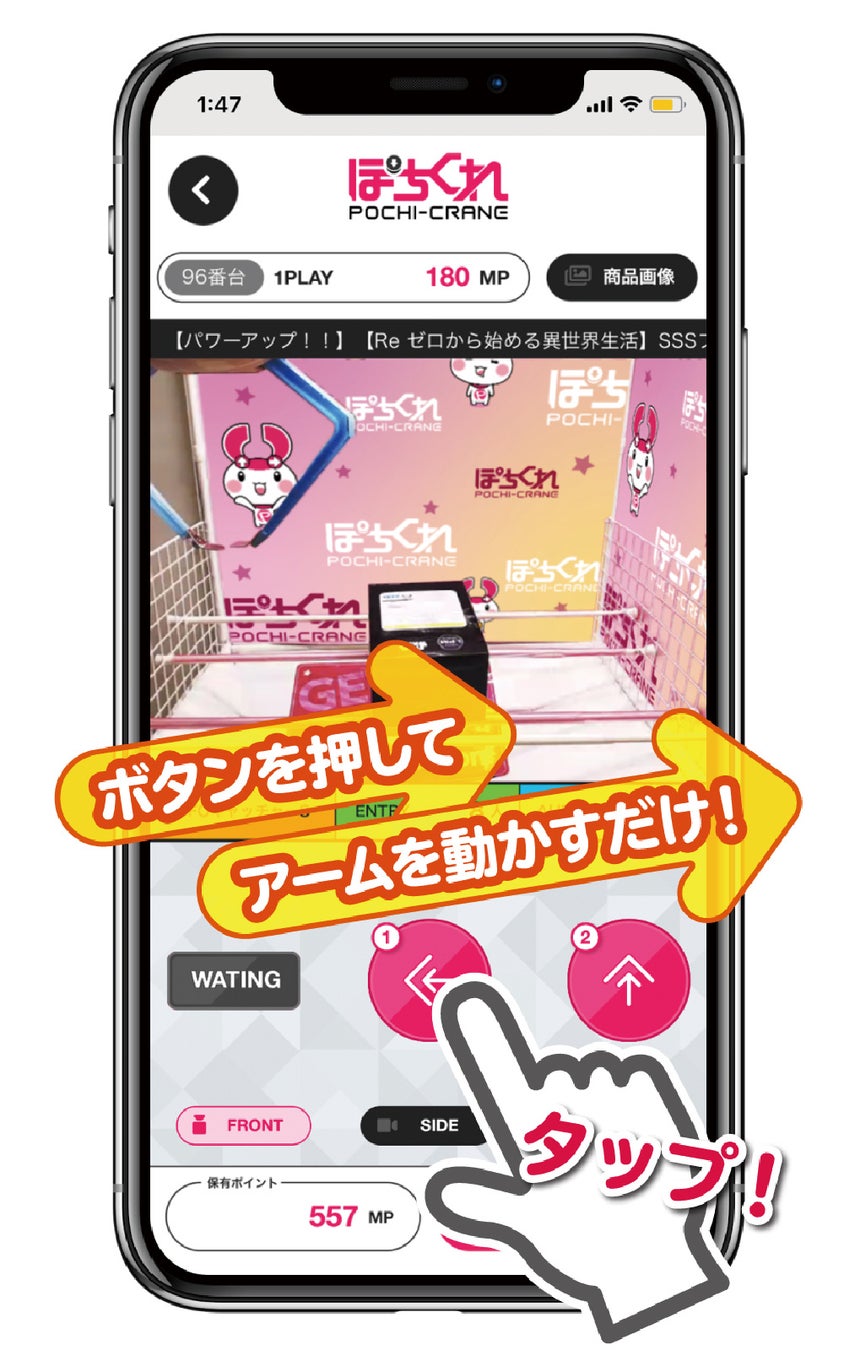 ゲームセンターと同じ本物のクレーンゲームをスマートフォンやパソコンからリアルタイムに遠隔操作するオンラインクレーンゲームです。クレーンゲームの筐体には複数のカメラを設置し様々な視点からクレーンの操作を確認することができます。人気キャラクターのフィギュアや雑貨をはじめ、豊富な景品を取り揃えております。獲得した景品は、日本全国無料で配送します!