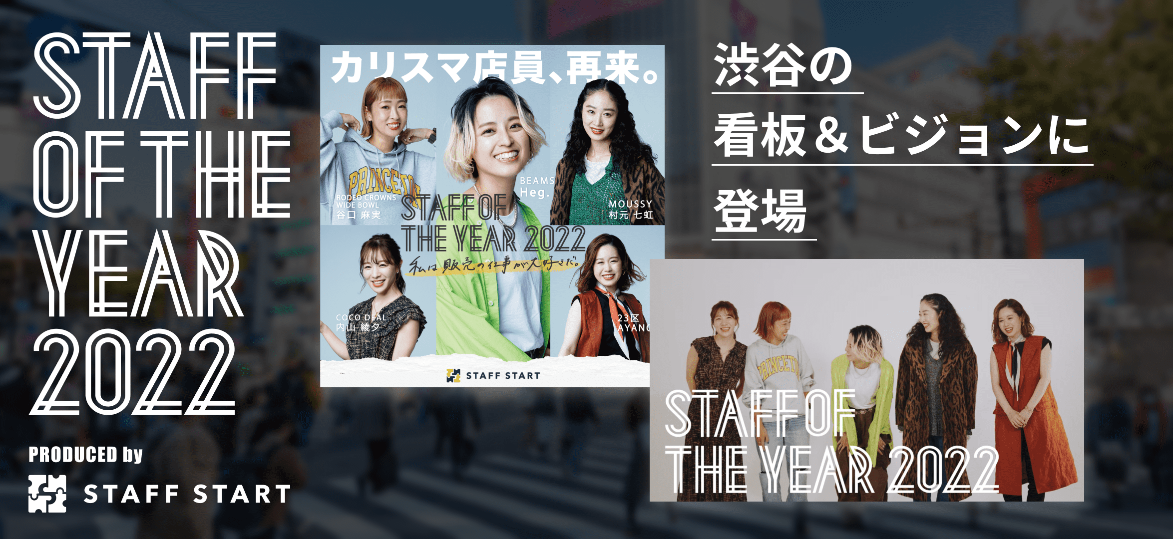 スタッフDXのアプリケーションサービス「STAFF START(スタッフスタート)」を運営する株式会社バニッシュ・スタンダード(本社:東京都渋谷区、代表取締役:小野里 寧晃)が開催した、8万人の店舗スタッフから日本一を決める『STAFF OF THE YEAR 2022』。同コンテストで選ばれた上位5名のカリスマ店員“STAFF OF THE YEAR”が、渋谷の街頭看板(掲載期間:9/16Fri.〜9/29Thu. ※予定)、渋谷の大型ビジョン(放映期間:9/19Mon.〜9/25Sun.)に登場します。