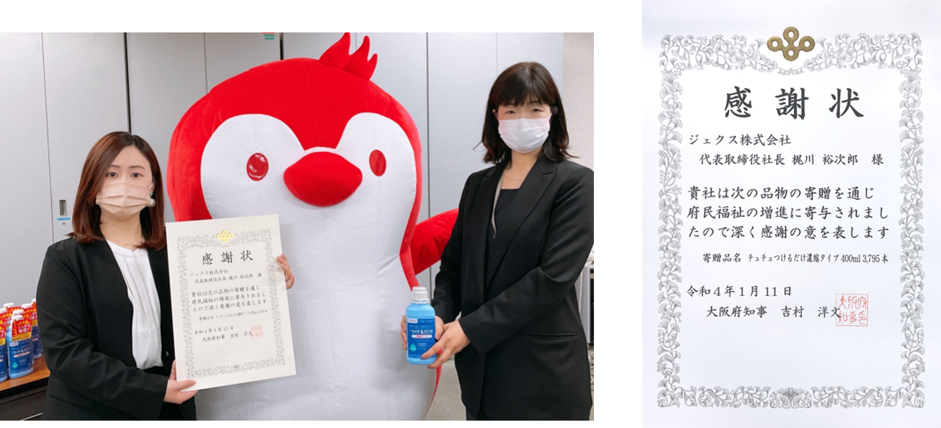 ▼左:寄贈に関して感謝状を受けたジェクス株式会社 開発マーケティング本部 企画部 三木望 氏