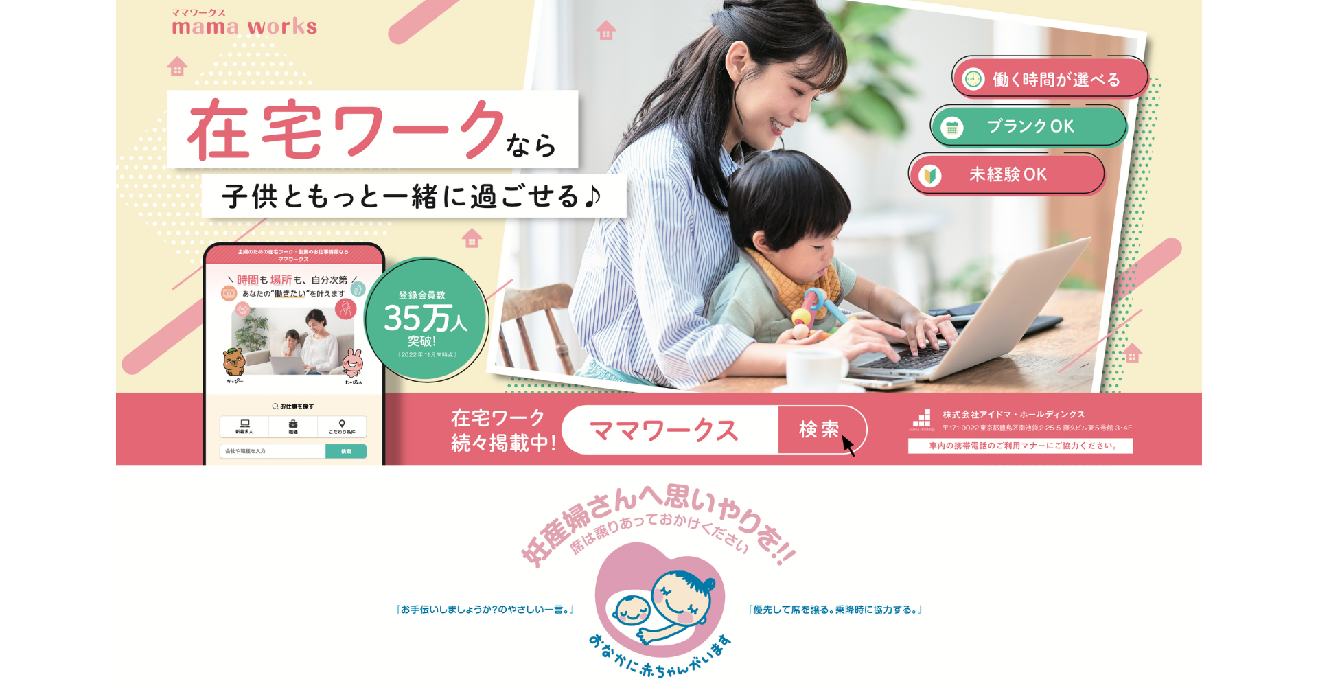 人の力とテクノロジーで再現性のある経営ソリューションを提供する株式会社アイドマ・ホールディングス(本社:東京都豊島区、代表取締役:三浦 陽平、以下:当社)は、当社が運営する“主婦のための在宅ワーク求人サイト”「ママワークス(mama works)」とマタニティマークとのタイアップ広告を都営地下鉄三田線の優先席エリアにて掲出したことをお知らせします。