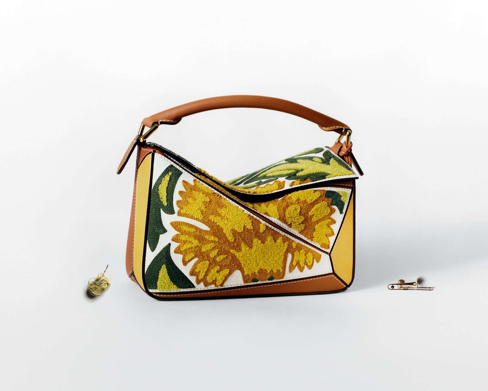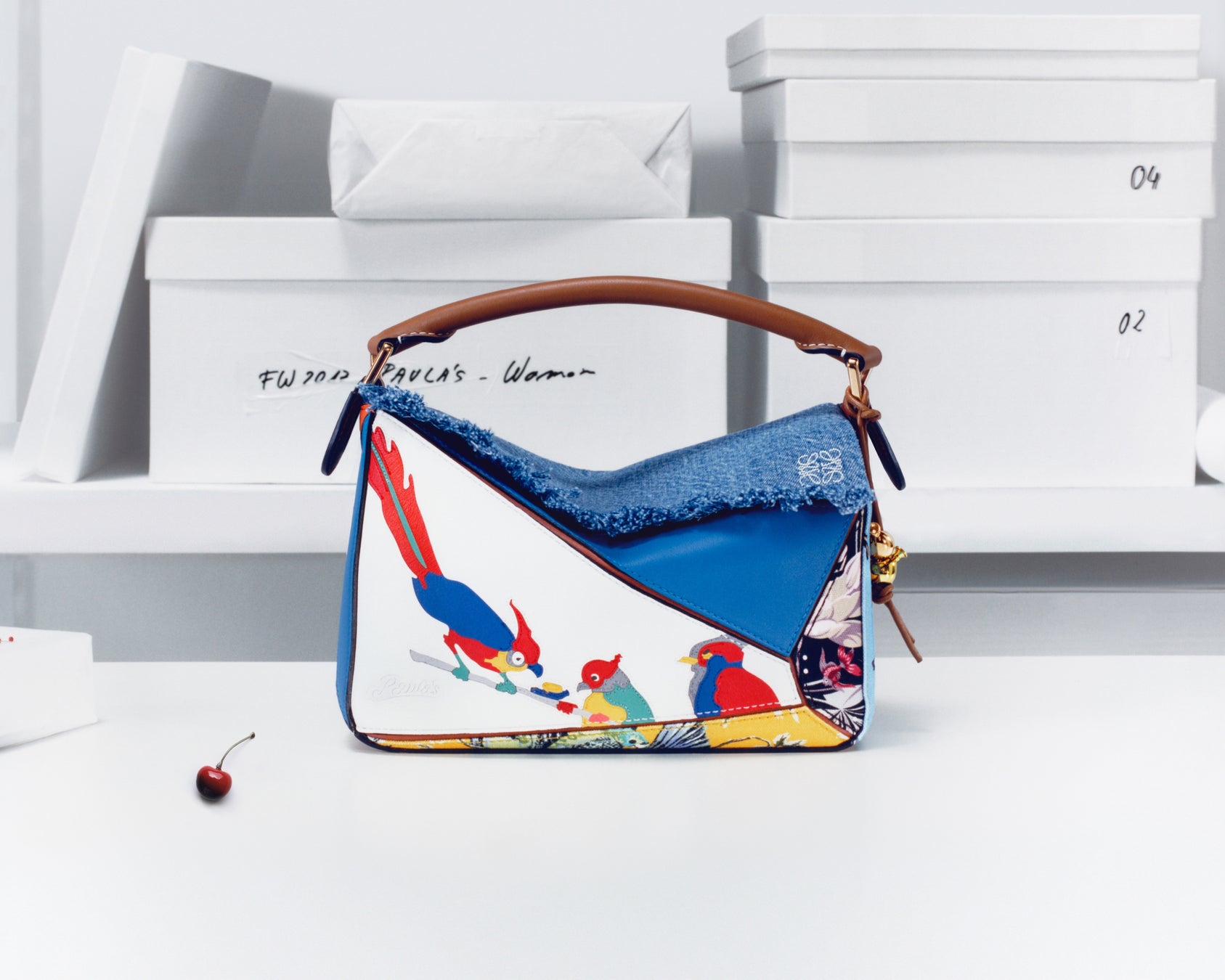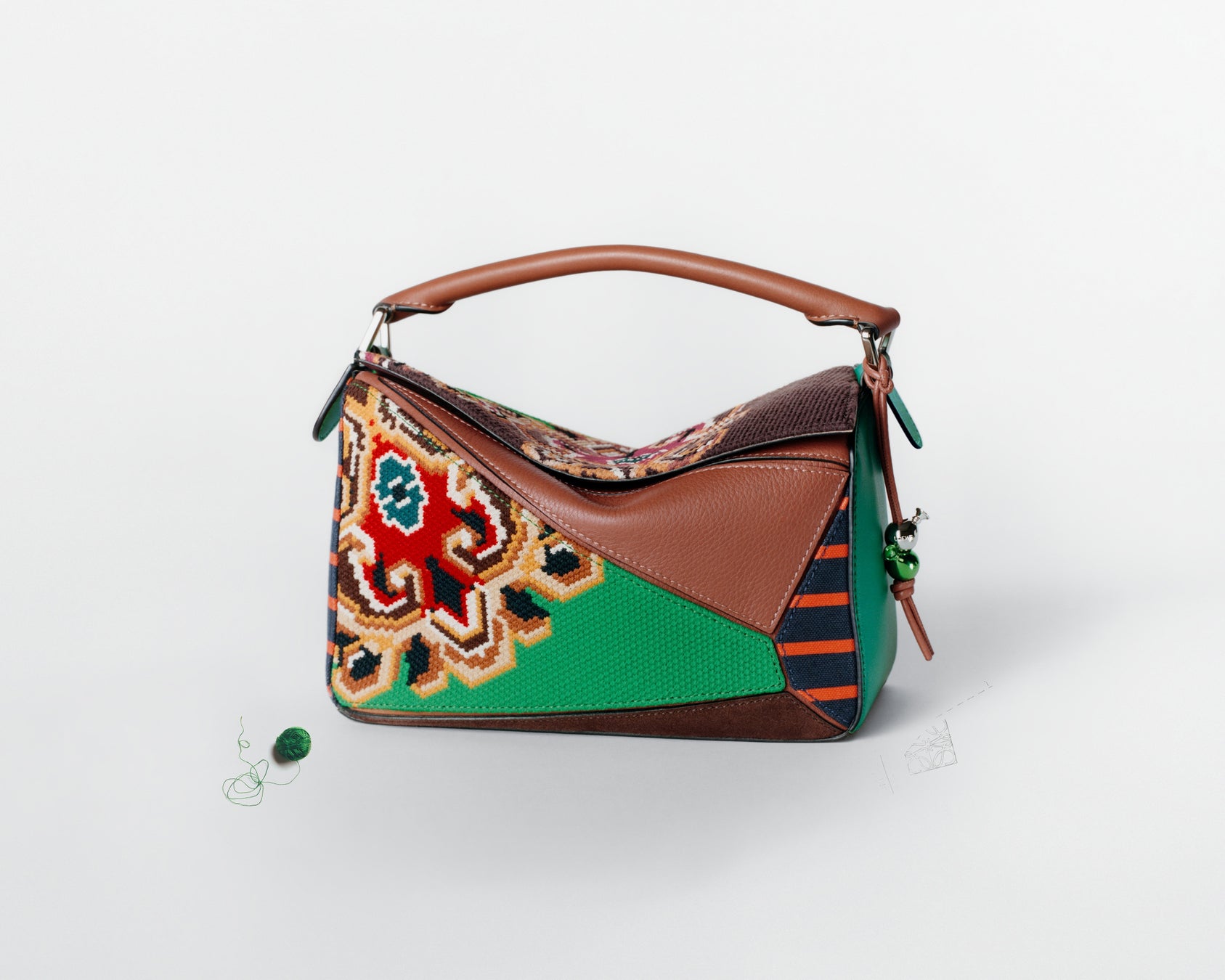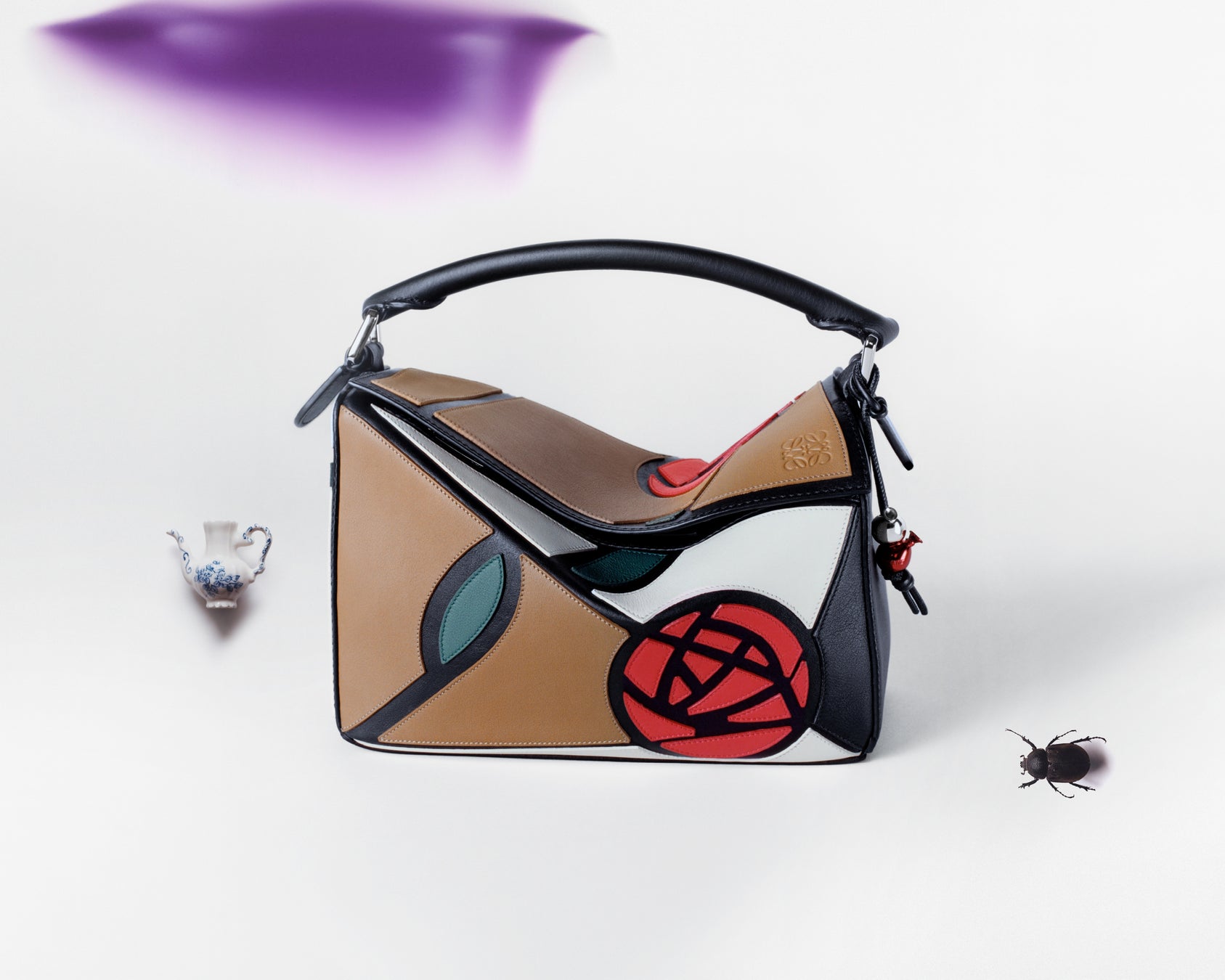 この限定コレクションは、スペインにあるロエベのアトリエと、ロエベならではの遊び心の証左となっています。各バッグはアップリケ、刺繍、クロスステッチ、そしてロエベを象徴するレザーマルケトリーなどさまざまな技術を用いています。あるものは絵画的なモチーフで装飾され、またあるものは詩の言葉を着想源としており、周年を記念したメタルプレートと2つのバルーンチャームがあしらわれています。