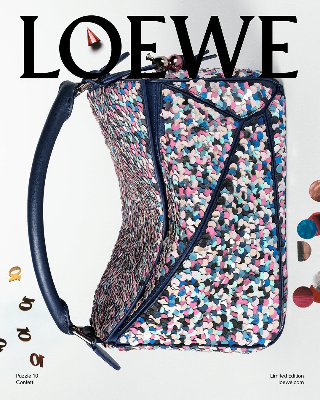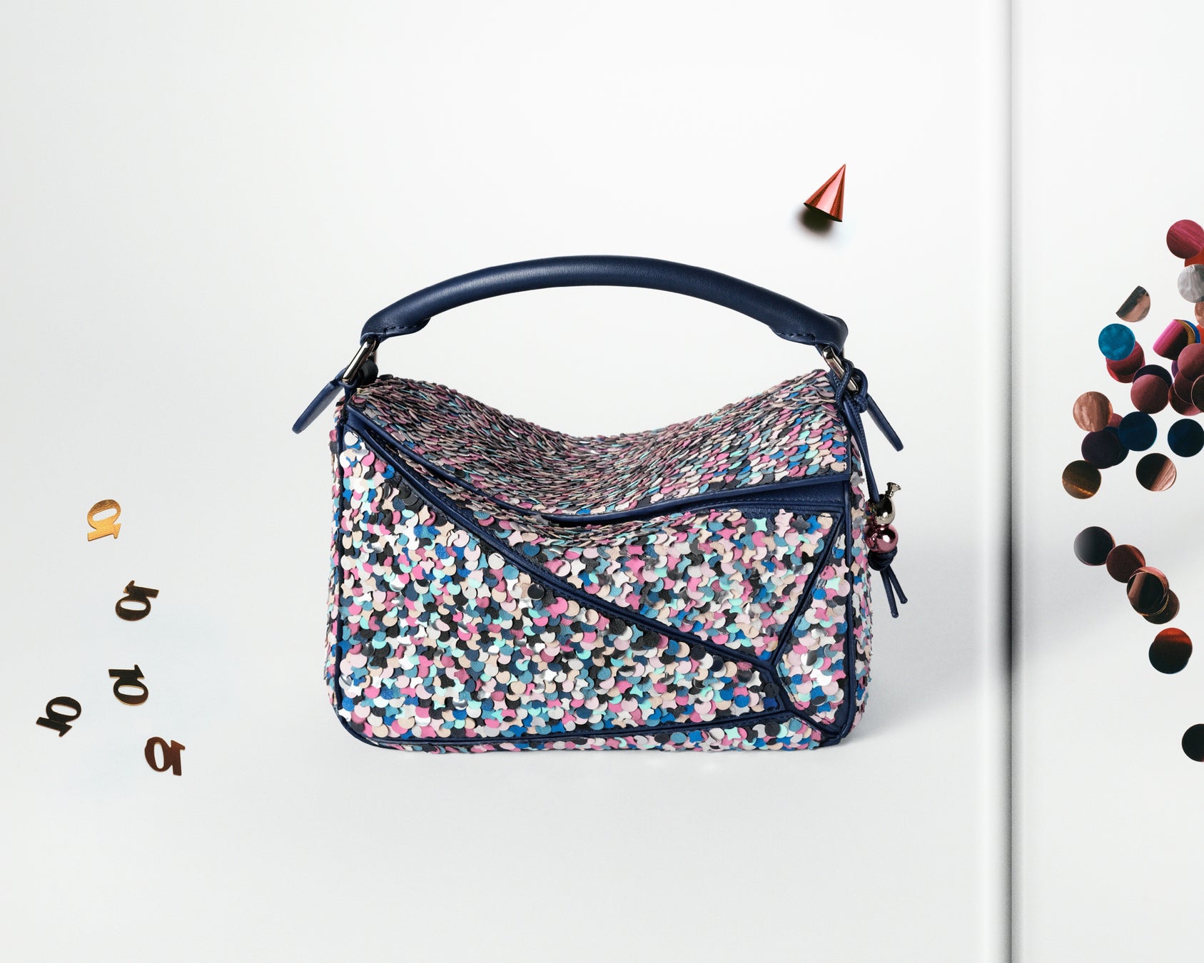 アニバーサリーにはお祝いがつきものです。パズルの10度目の誕生日を記念して、レザーのバッグ全体に何千ものコンフェッティを手仕事であしらった、サプライズ エディションが登場しました。
