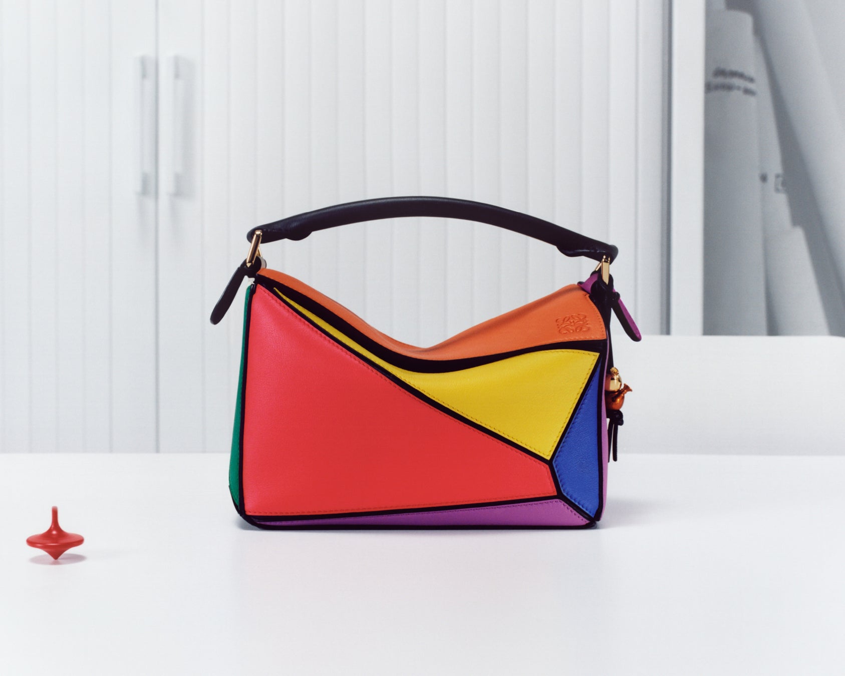 2017年までに、パズルバッグは大胆で個性的な幾何学的フォルムですでに広く知られていました。2017春夏ウィメンズ プレコレクションでは、そのアイコニックなデザインを鮮やかな色彩のパッチワークで表現しました。レッド、イエロー、ブルーといった主なカラーと、明るいオレンジや鮮やかなパープルは互いに対照的で、レザーのベースと縁取りによってポップアートを思わせるカラーブロックが生まれています。このパズルバッグは、色彩の実験に取り組んだ時期を象徴するモデルです。