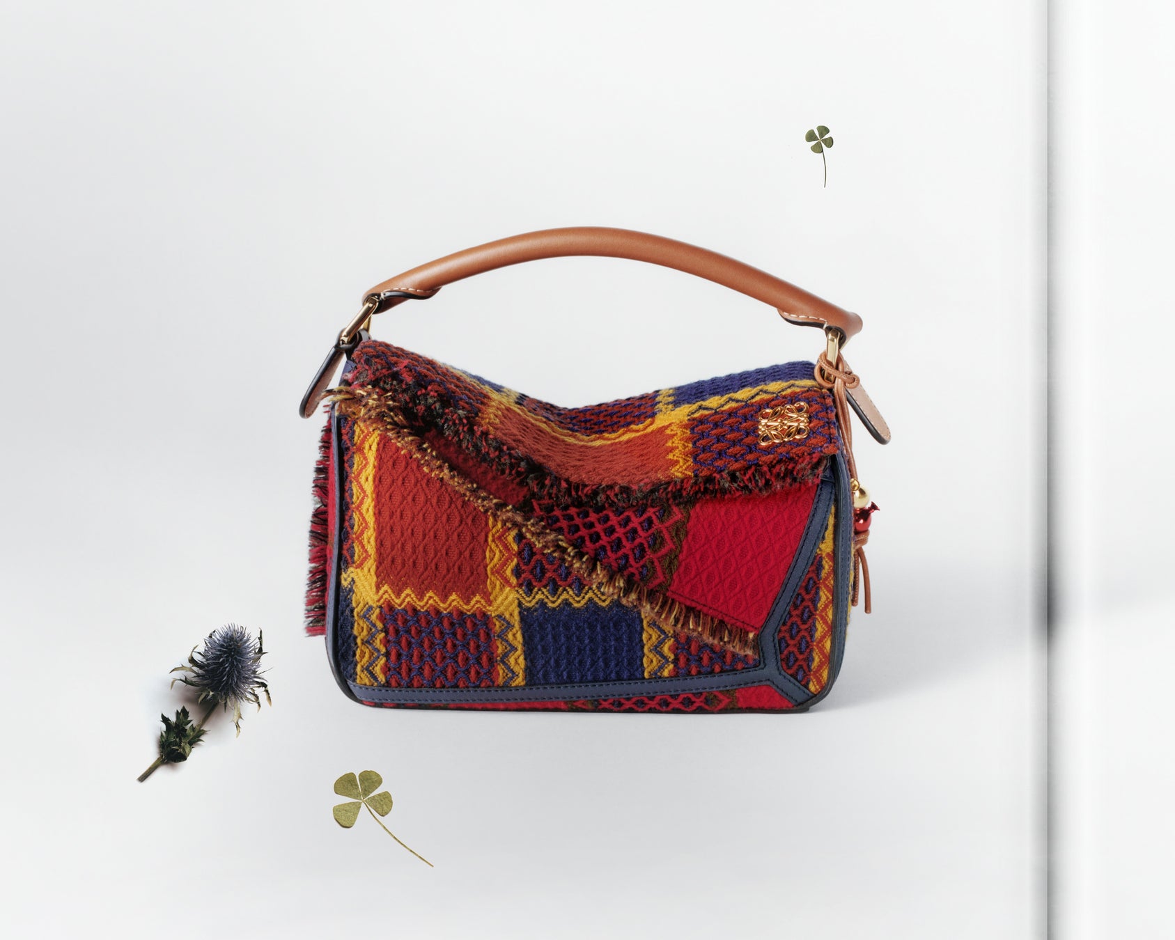 幾何学的なパネルをチェック模様やフリンジ、レザーパイピングが構成しており、レッド、イエロー、ネイビーブルー、カーキ、そしてアクセントとしてラスティオレンジが用いられています。各パネルは隣り合うパネルと異なる表情を見せていて、コントラストと折衷的な印象が感じられます。