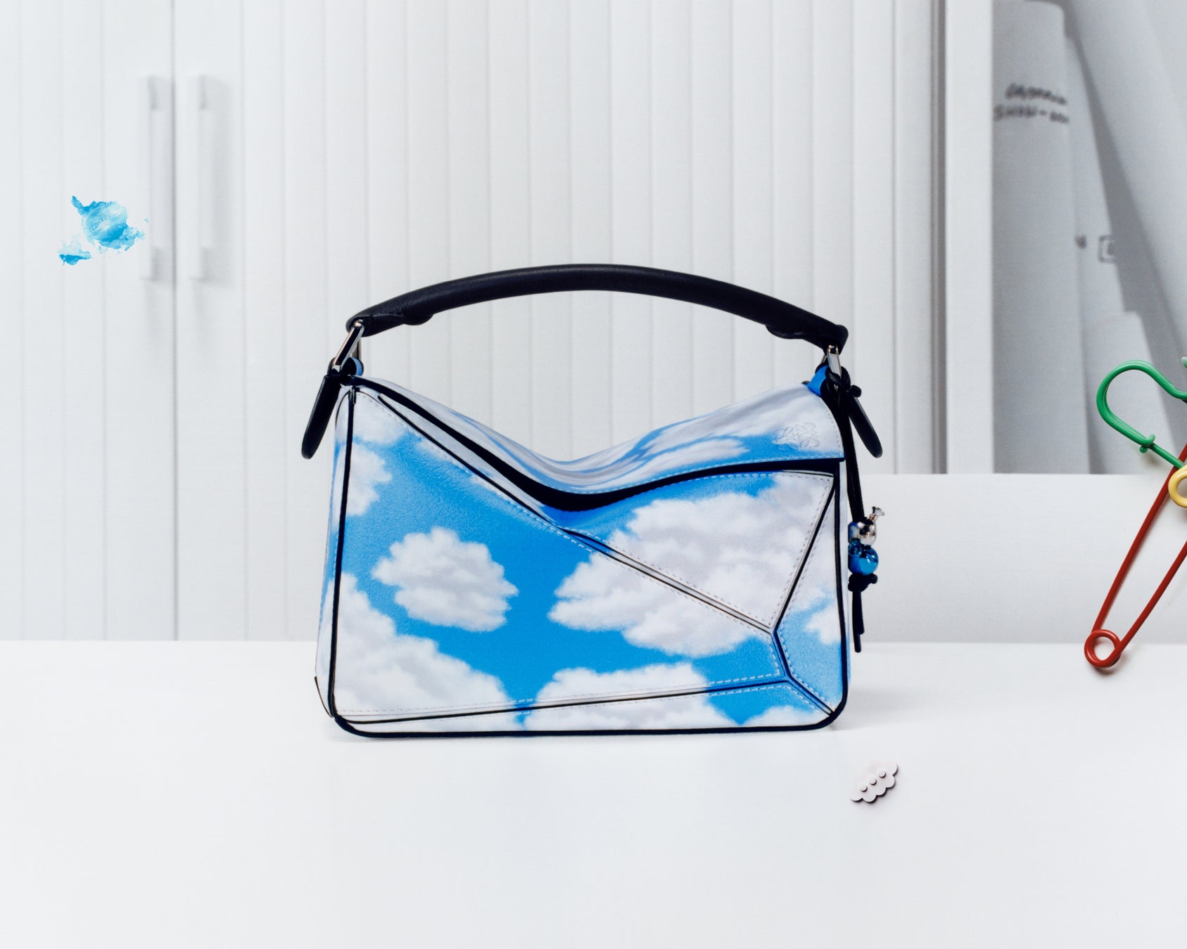 クラウド パズルバッグは、意外性ある写実的なプリントが展開された2017春夏ウィメンズコレクションで発表されました。クラシックカーフで作られた本モデルは、各パネルの継ぎ目をまたいで雲のプリントが全面に施されており、軽やかさがシュールに表現されています。