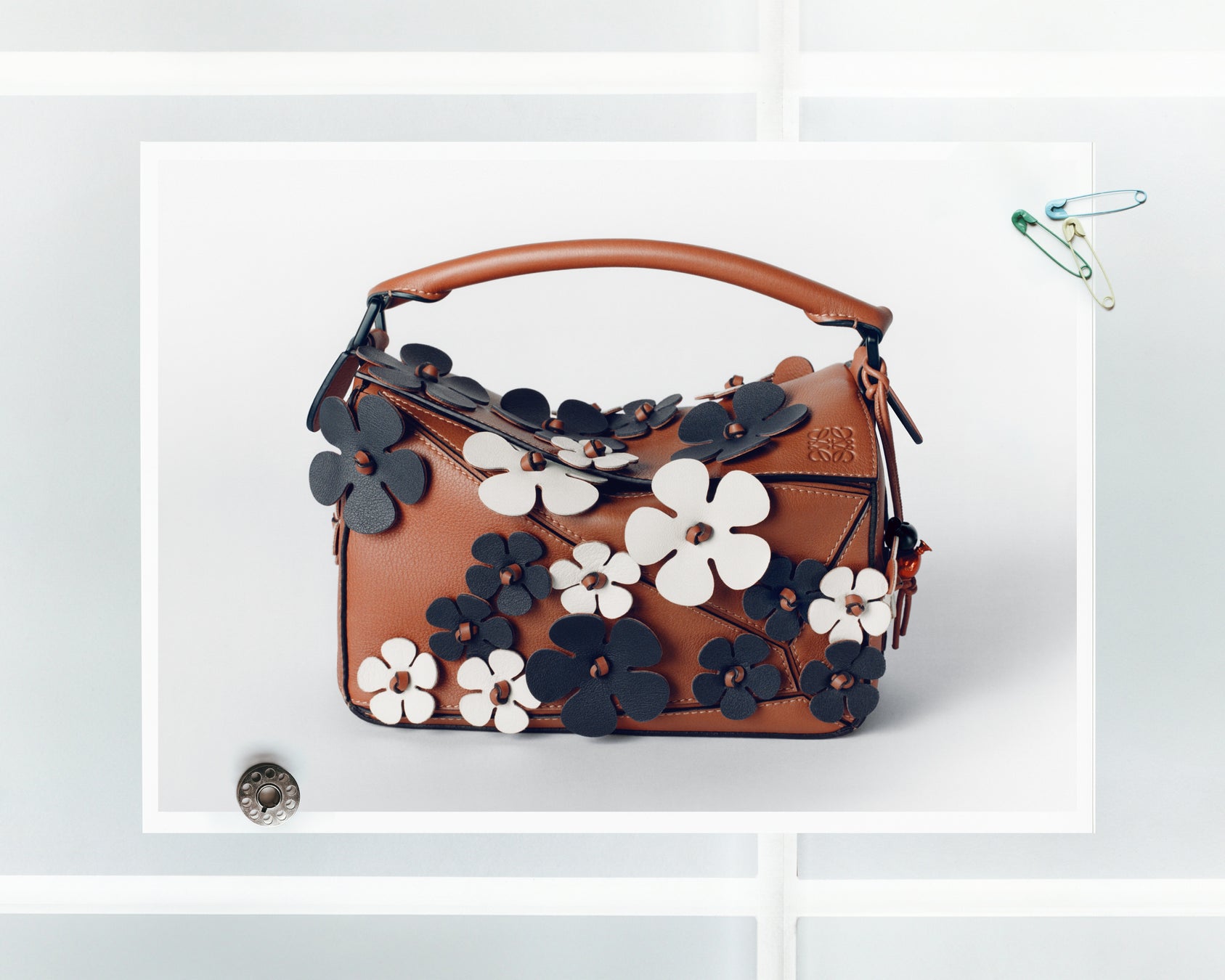 花は、2019春夏プレコレクションで登場したこのパズルバッグの主要なモチーフとなっています。彼の作品世界へのオマージュとして仕立てられたこのバッグは、ホワイトとタンのレザーパネルを、ブラックの太いレザーで縁取っており、ステンドグラスの各パーツを囲むリード線を模しています。