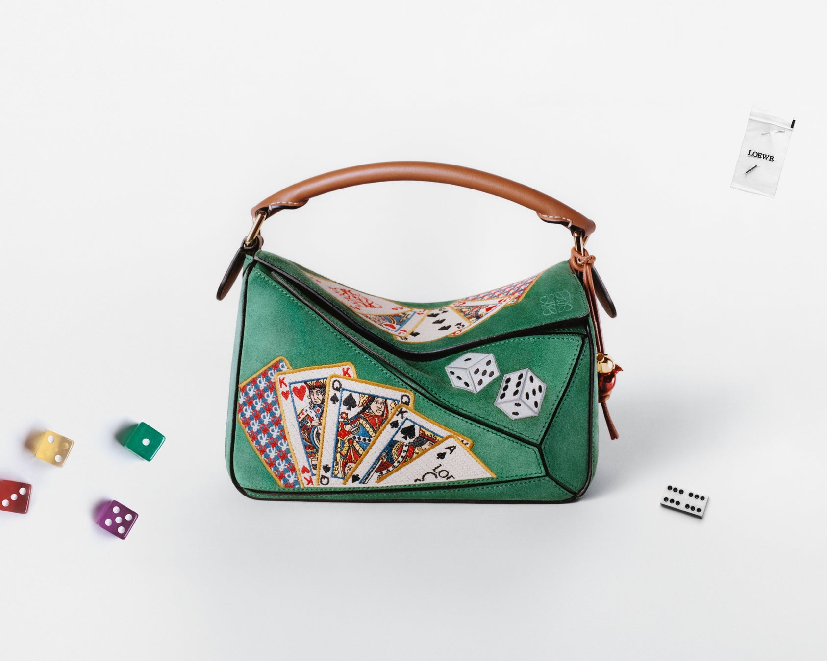 手札には、精巧な刺繍と金糸で縁取られたキングとクイーン、そしてロエベの「スペードのエース」が見えます。他にも幸運を呼ぶモチーフとして、2つのサイコロ、馬蹄、四つ葉のクローバーが描かれています。