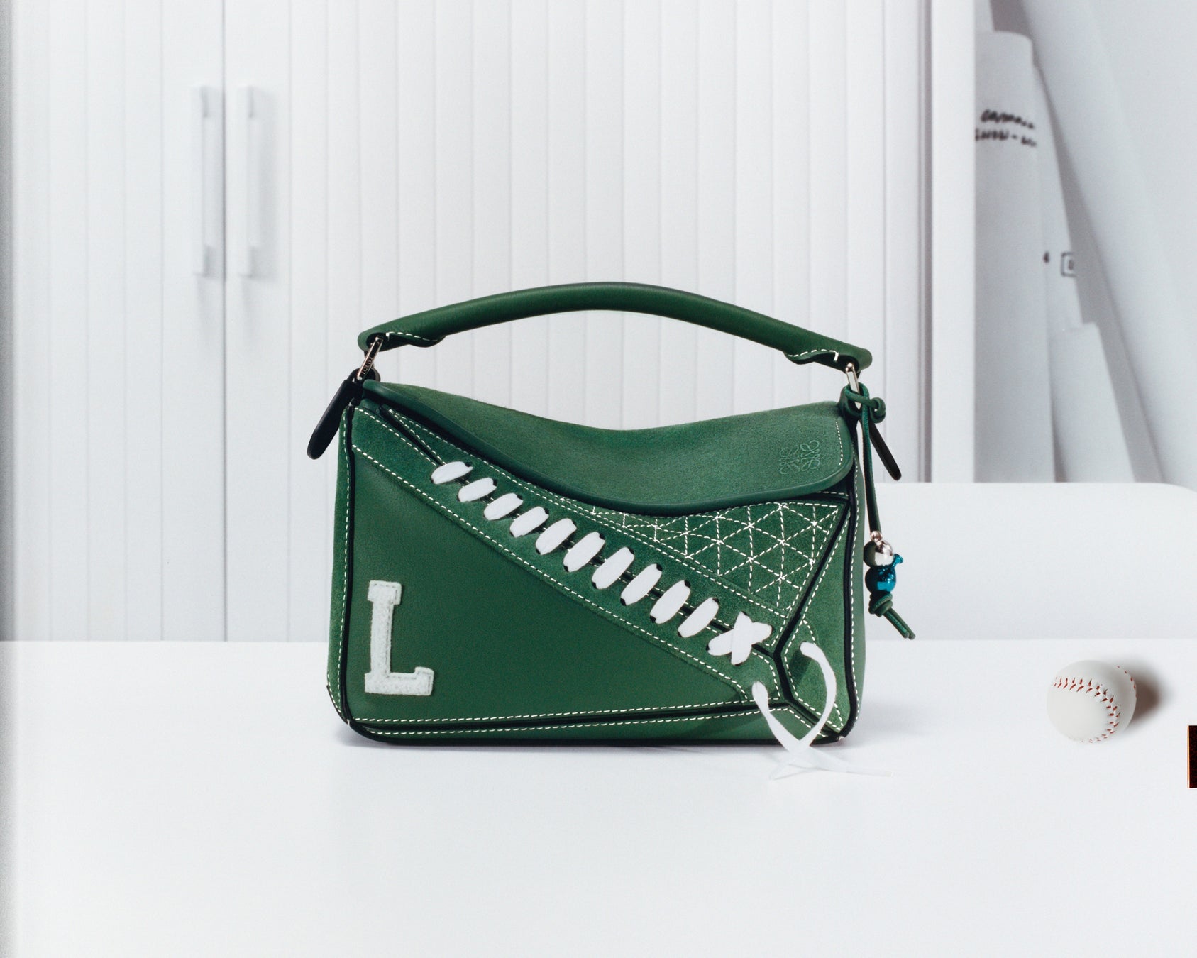 このパズルバッグは、2018秋冬メンズ プレコレクションで発表されたもので、着想の起点となったのは、直前のウィメンズランウェイに登場した、風変わりなカールしたつま先のハイトップスニーカーでした。エメラルドグリーンのスエードとカーフで仕立てられたこのバッグは、クラシックなスポーツシューズの魅力を、遊び心のある再解釈でバッグに落とし込みました。2枚の大きなフロントパネルには、肉厚な平紐の「シューレース」が通されており、バッグ底面側の隅で、結ばずに垂らされています。スエードに配されたコントラストの効いたステッチは、グラフィカルなパターンを際立たせています。白糸の装飾ステッチや、バッグの隅にあしらわれたバーシティスタイルの「L」のワッペンは、スポーツからの着想をさらに示唆しています。