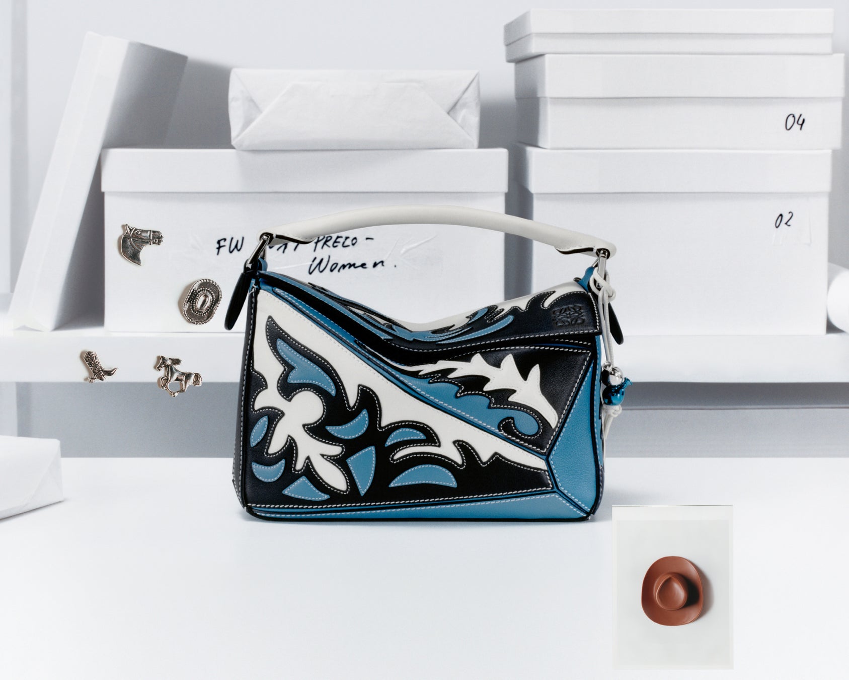 アメリカに初のカサロエベをオープンした年、パズルバッグは2019秋冬プレコレクションにおいてアメリカの伝統文化へ讃歌を送りました。ホワイト、ブラック、デニムブルーのレザーを重ねたデザインは、ウエスタンブーツ特有の抽象的な葉模様や渦巻き模様を思い起こさせ、さらに各パネルのコントラストステッチがそのディテールを際立たせています。カウボーイカルチャーはさまざまなサブカルチャーに影響を及ぼし、今では日常の定番アイテムとして定着していますが、このパズルバッグは、カウボーイカルチャーを本来の文脈から切り離し、スケールの遊びと幾何学的フォルムによる再構築を経て、オマージュを捧げているのです。