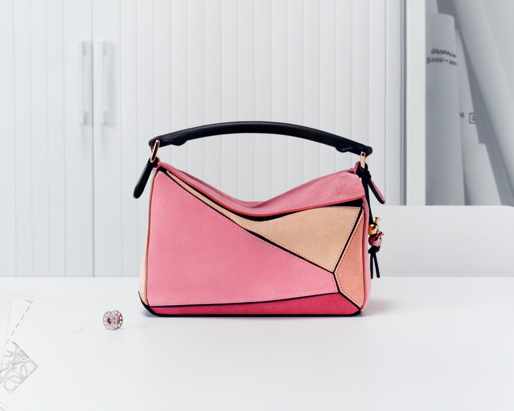 その幾何学的なセクションに大胆なフューシャから淡いコーラルやサーモンまで多彩なピンクの色調を映し、最も柔らかくなめらかなカマイユ スエードで造形されたこのパズルバッグには、形状・素材・構造への新鮮なアプローチを見ることができます。