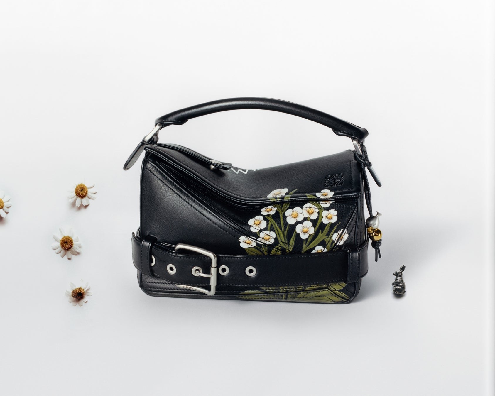 このウィリアム・モリスのバッグでは、自然のイラストレーションとパンク的な装飾のコントラストをなしています。「役に立たないもの、美しいと思わないものを家に置いてはならない」というモリスのアーツ・アンド・クラフツ運動の名言は、19世紀半ばの当時と変わらず、現代でも深く響きます。そのラディカルで反骨的な精神はロエベにも息づいており、店舗の建築ディテールやインテリアをはじめ、クラフトや手仕事へのこだわりに彼の影響を見てとることができます。このパズルバッグも、自然に触発されたプリントや家具で知られたモリスを着想源としています。イチゴの花や野ウサギのプリント(ハンドペイントのレザージャケットにも展開されたもの)と、バイカージャケットを彷彿とさせるシルバーのアイレット付きのパンク風なベルトやスタッズ付きのショルダーフラップ(肩章)が組み合わされており、アーツ・アンド・クラフツとパンクという一見対照的な二つの運動が共存しています。