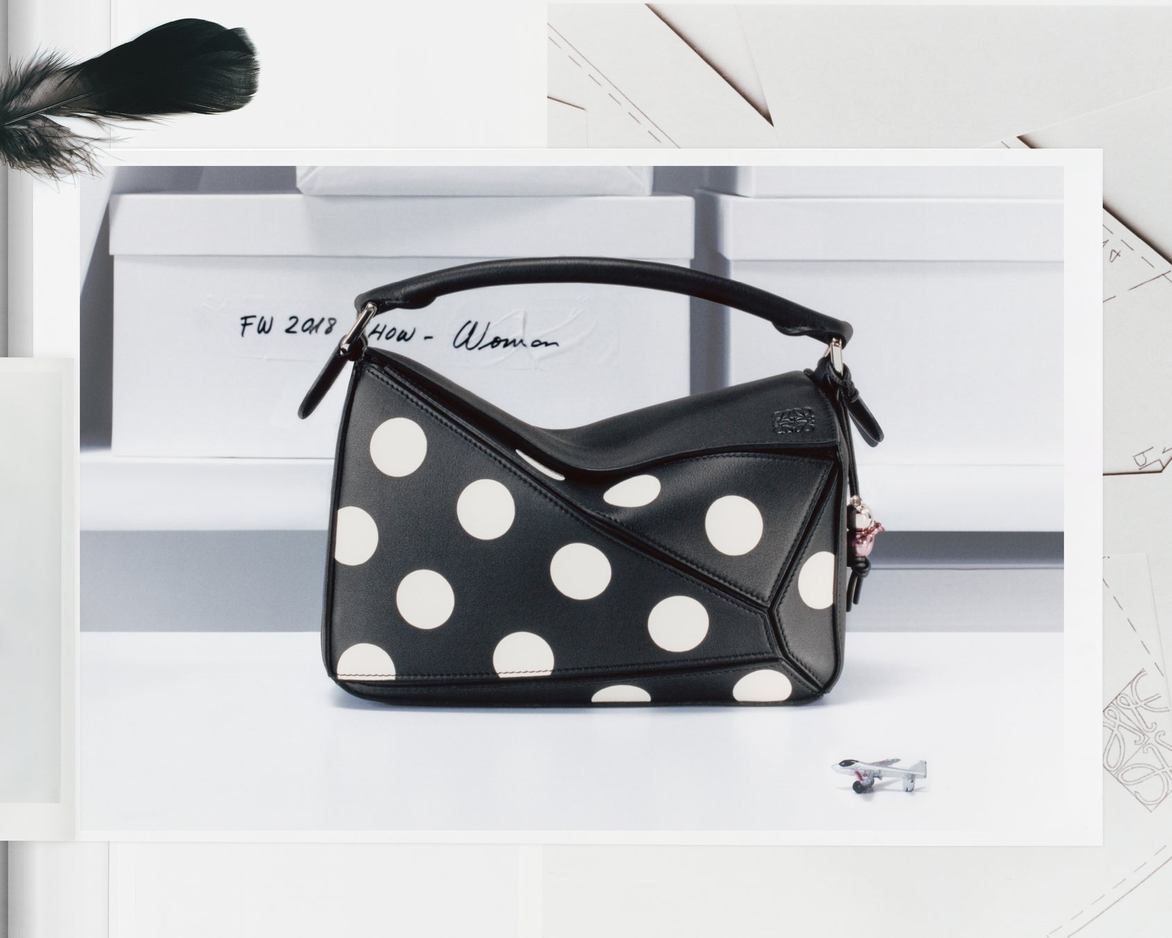 ロエベのランウェイでは、フォルムの実験やシルエットの常識を覆すようなアプローチが繰り返し登場します。そんな斬新さと対比するように、2018秋冬ウィメンズコレクションでは、遊び心あふれるロマンティックなポルカドット(水玉模様)が提示されました。本コレクションで発表されたこのパズルバッグでは、幾何学的なポルカドットがあしらわれています。ひとつひとつのドットがインターシャ技法で描かれ、非常に洗練された仕上がりとなっています。丸みのあるドットは幾何学的なパズルのフォルムに力強いコントラストを与え、アイコニックな構造美をさらに際立たせています。