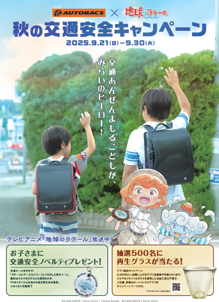 また、期間中の9月21日(日)~9月30日(火)には、アニメ「地球のラテール」とコラボした「秋の交通安全キャンペーン」を実施いたします。
