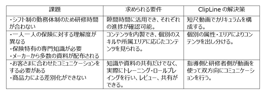 多様な保険商品を正確に効率よく理解し、対面販売力を強化するにあたり、動画による双方向通信や個別の学習状況が確認できる機能、個人ごとにコンテンツが出し分け可能な仕様などが評価され、ClipLine導入が決定しました。